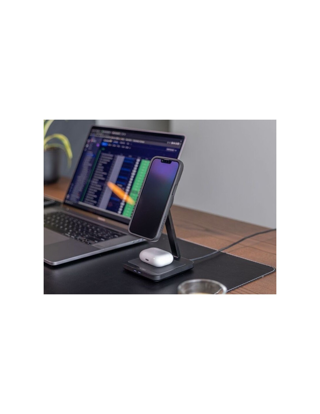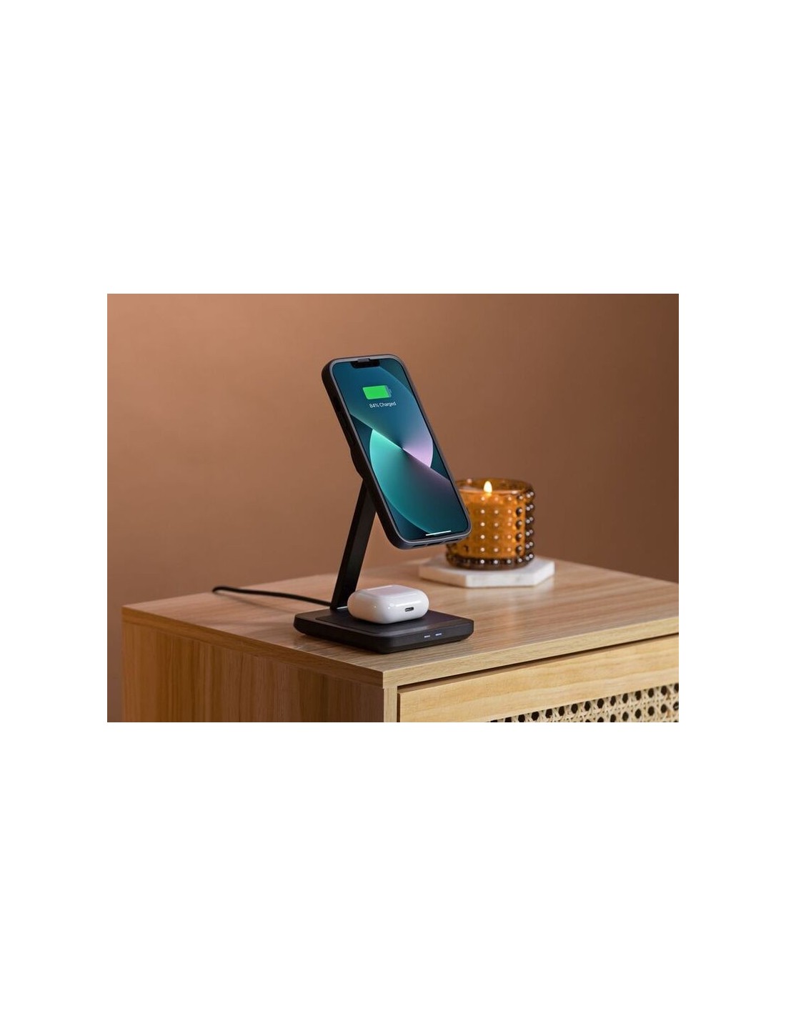 Con una base de aluminio mecanizado y una almohadilla de agarre suave al tacto, el cargador inalámbrico dual de sobremesa es la forma más elegante de cargar el teléfono y los accesorios en el hogar o la oficina.