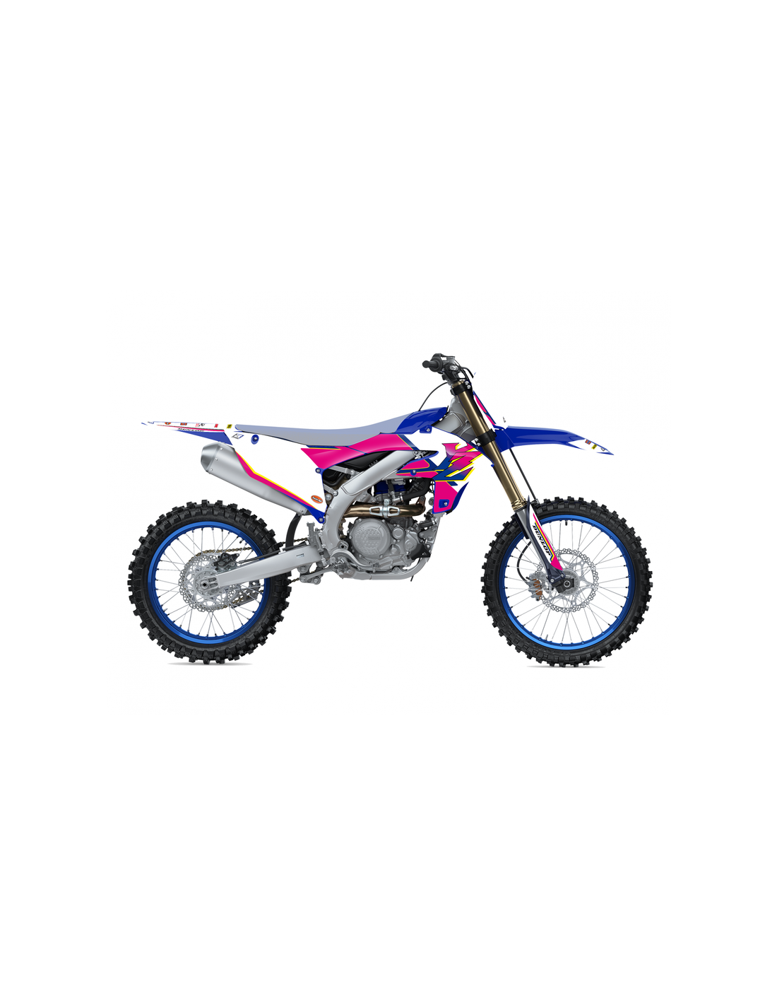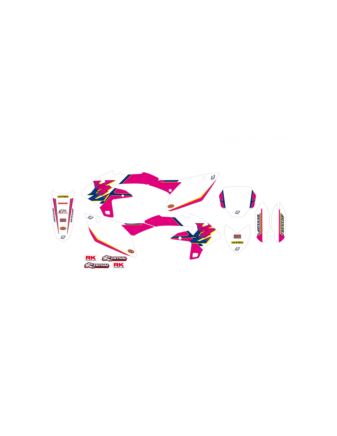 Las gráficas adhesivas para motocross, enduro, motard y trial se realizan con materiales muy eficaces y de calidad óptima. Se utiliza el material crystall con espesor 0,5mm combinado a un adhesivo muy fuerte estudiado específicamnete para la aplicación en el sector off-road. Aglutinante muy fuerte y resistente en el tiempo. Impresión serigráfica con tintas resistentes y brillantes. Durante la aplicación, es necesario calentar siempre el adhesivo con un secador haciendo una leve presión para obetener el resultado optimal. Para aplicar estos materiales no es necesario utilizar jabones o solventes, solo hay que limpiar bien la superficie con un producto seco o utilizar nuestro espray dedicado.
