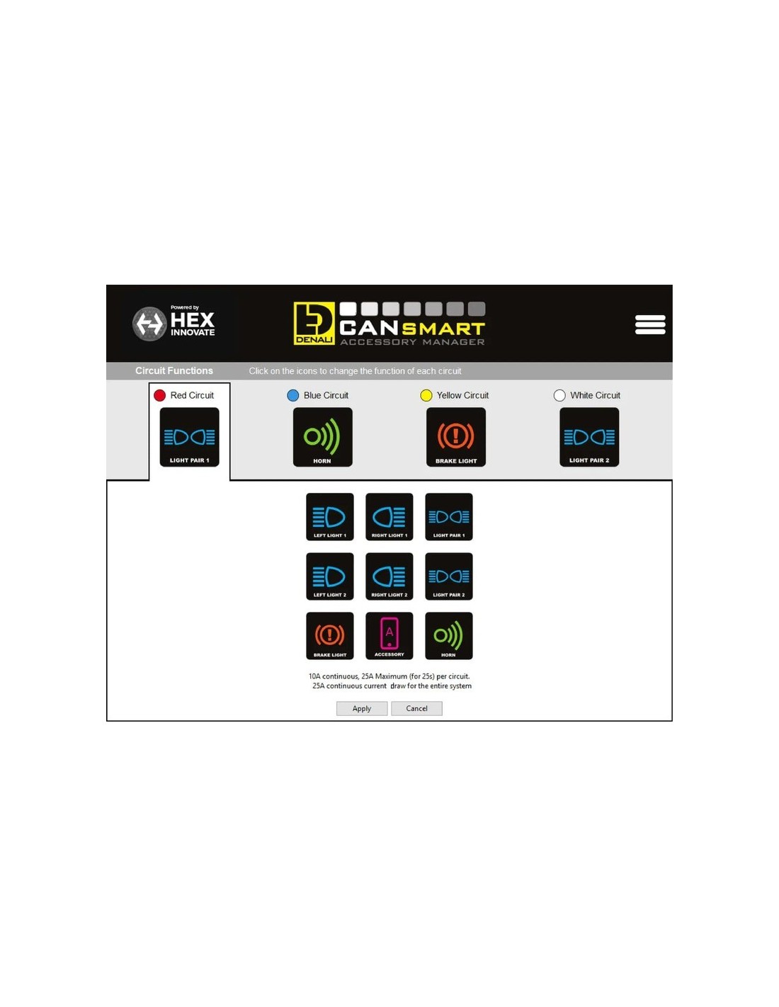 - Selector de función de circuito - El selector de función de circuito del software CANsmart te permitirá hacer funcionar cualquier accesorio de tu elección en cualquiera de los cuatro circuitos. Haz clic en el icono de un circuito para abrir el menú desplegable y seleccionar de la lista de funciones de circuito disponibles.