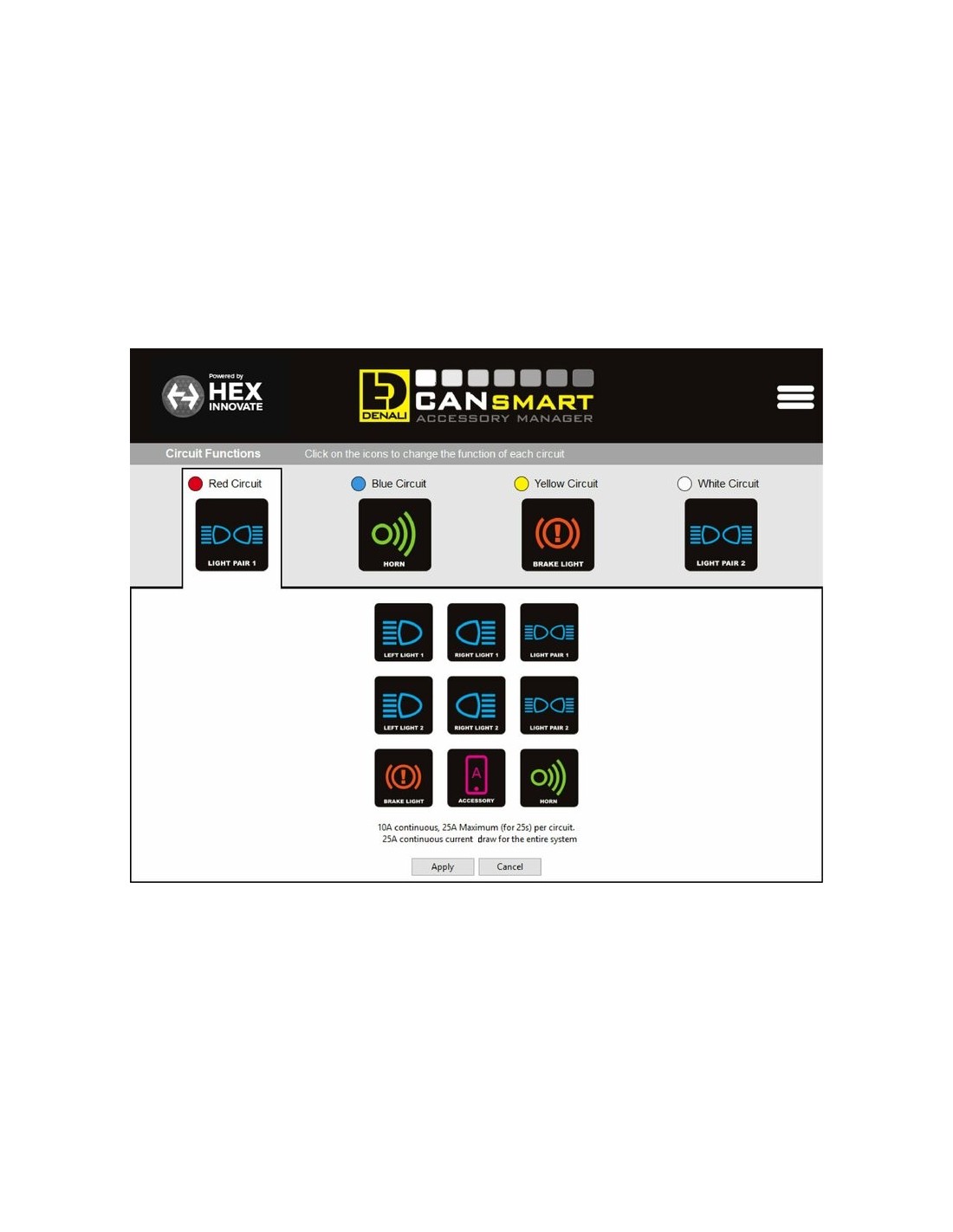 - Selector de Función del Circuito - El Selector de Función del Circuito en el software CANsmart le permitirá ejecutar cualquier accesorio de su elección en cualquiera de los cuatro circuitos. Haga clic en un ícono de circuito para abrir el menú desplegable y haga su selección de la lista de funciones de circuito disponibles.