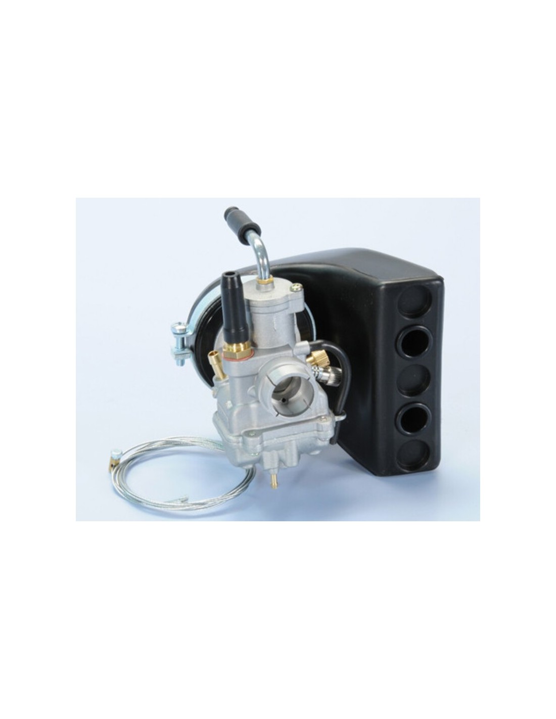 El tubo de admisión es muy corto y presenta un diseño axial exclusivo y una geometría que optimiza el flujo de aire al pasar el acelerador. El rebosadero de combustible del pulverizador se ha diseñado para garantizar una dinámica de flujo correcta en cada posición de la válvula de mariposa cuando se abre. El orificio de entrada de gasolina y la aguja más ancha garantizan un caudal constante incluso en las condiciones más extremas. El nivel del flotador, totalmente de plástico, y la junta de la aguja se comprueban cuidadosamente en la producción para garantizar la misma eficacia a lo largo del tiempo. Estas características hacen que el ajuste del carburador sea mucho más sencillo.