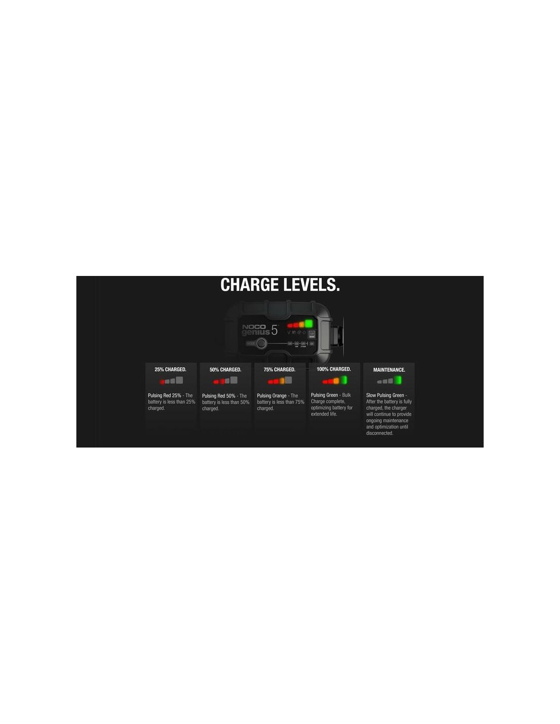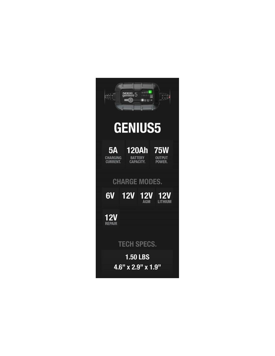 Presentamos el NOCO Genius 5, uno de los cargadores más potentes, de mayor rendimiento, eficiencia energética y compactos de NOCO hasta la fecha. El Genius 5 es al mismo tiempo cargador, mantenedor y desulfatador de baterías de 6 y 12 voltios, con una capacidad de 5 amperios para baterías de plomo de automoción, marinas y de ciclo profundo, además de húmedas, de gel, AGM, sin mantenimiento y de ion de litio.
