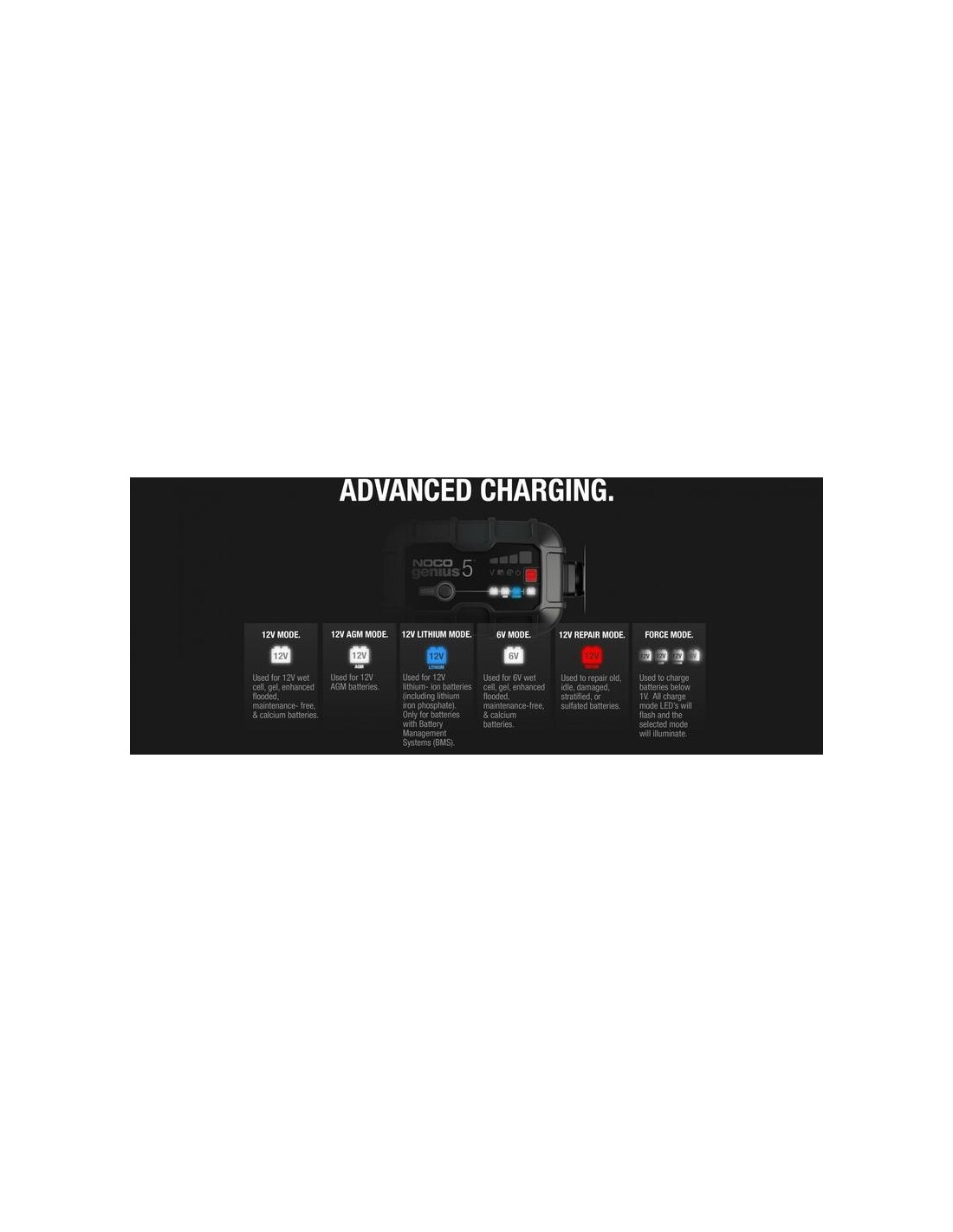 Haz más con Genius: Diseñado para baterías de 6 y 12 voltios de plomo-ácido en automoción, marinas y de ciclo profundo, además de baterías húmedas, de gel, AGM, sin mantenimiento y de ion de litio.
