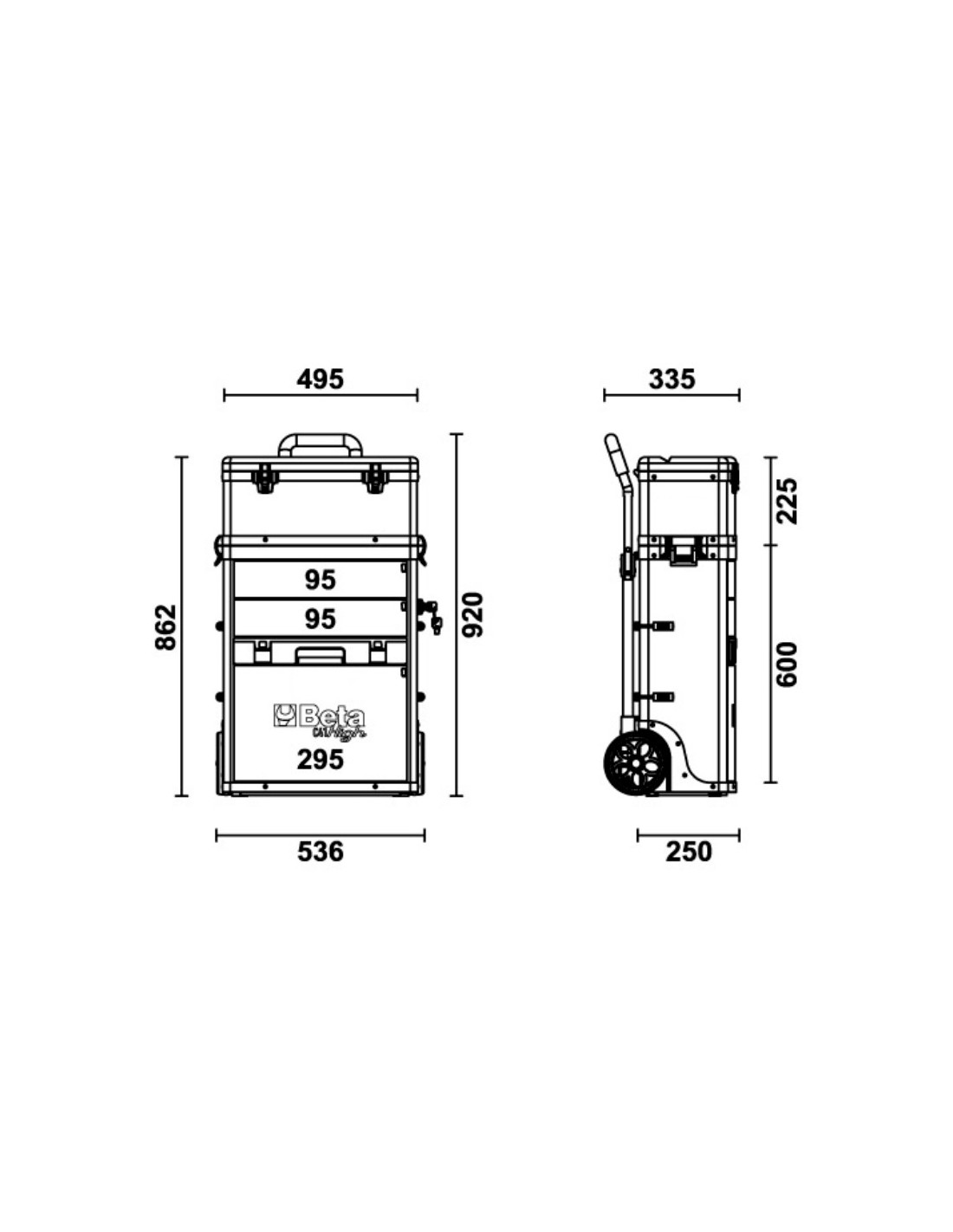 - 2 detachable modules: 1 upper tool box, 1 module with 2 drawers 95 mm in height, 1 pull-out case made of plastic, 66 mm high, and 1 drawer 295 mm in height.