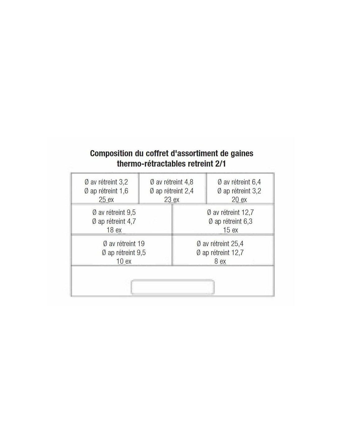 Surtido de manguitos de tubo termorretráctil (diámetros de 3'2 a 24'5 mm) 119 manguitos de 10 cm de longitud, en varios diámetros Coeficiente de retracción: 2/1 Temperatura de retracción: +90 °C Repuestos: 893263: 25 de diámetro 3'2 893264: 25 de diámetro 4'8 893265: 25 de diámetro 6'4 893266: 25 de diámetro 9'5 893267: 10 de diámetro 12'7 893268: 10 de diámetro 19 893269: 10 de diámetro 24'5""""