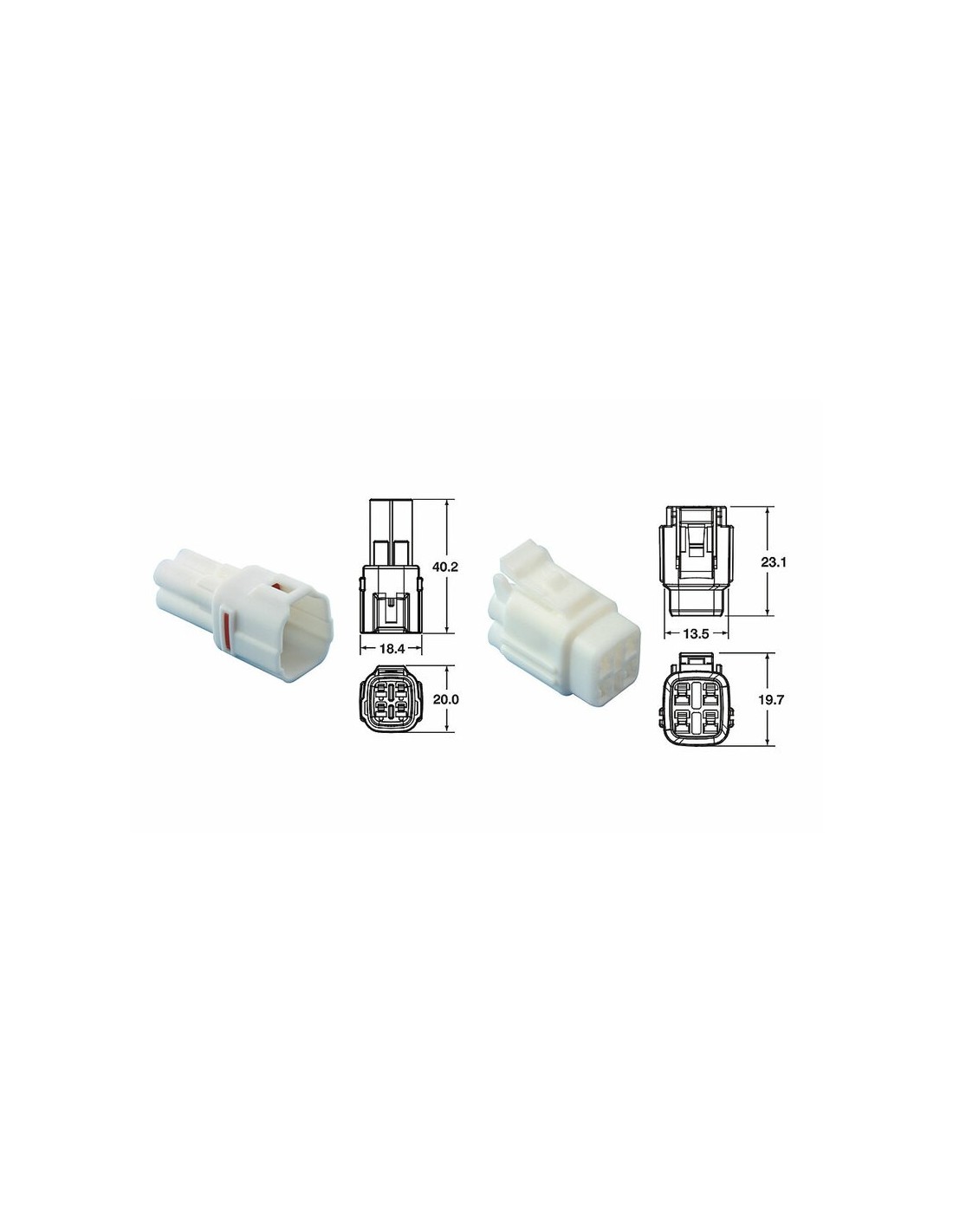 Juego completo (carcasas, cierres y juntas) de cinco terminales, estancos, de tipo OEM.Datos técnicos:Terminales macho y hembra de latón preestañado.Juntas de silicona. Temperatura operacional: -40°C /+120°C.Caída de tensión: 3 mV/AResistencia de aislamiento: 100 MO.Resistencia dieléctrica: 1000 VSección del cable: 0'85 mm² / 1'25 mm².Corriente eléctrica máxima: 13 ATipo 090 SMTO MT