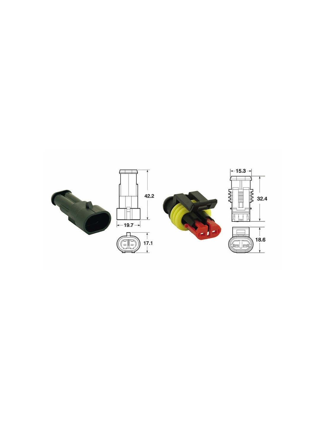 Juego completo (carcasas, cierres y juntas) de 5 terminales estancos, tipo OEM.Datos técnicos:Terminales macho y hembra de bronce fosforado preestañado.Juntas de siliconaTemperatura de funcionamiento: -40°C / +125°CCaída de tensión: 3 mV/AResistencia de aislamiento: 100 MO.Resistencia dieléctrica: 1500 VSección del cable: 0'85 mm² / 1'25 mm².Corriente eléctrica máxima: 10 A