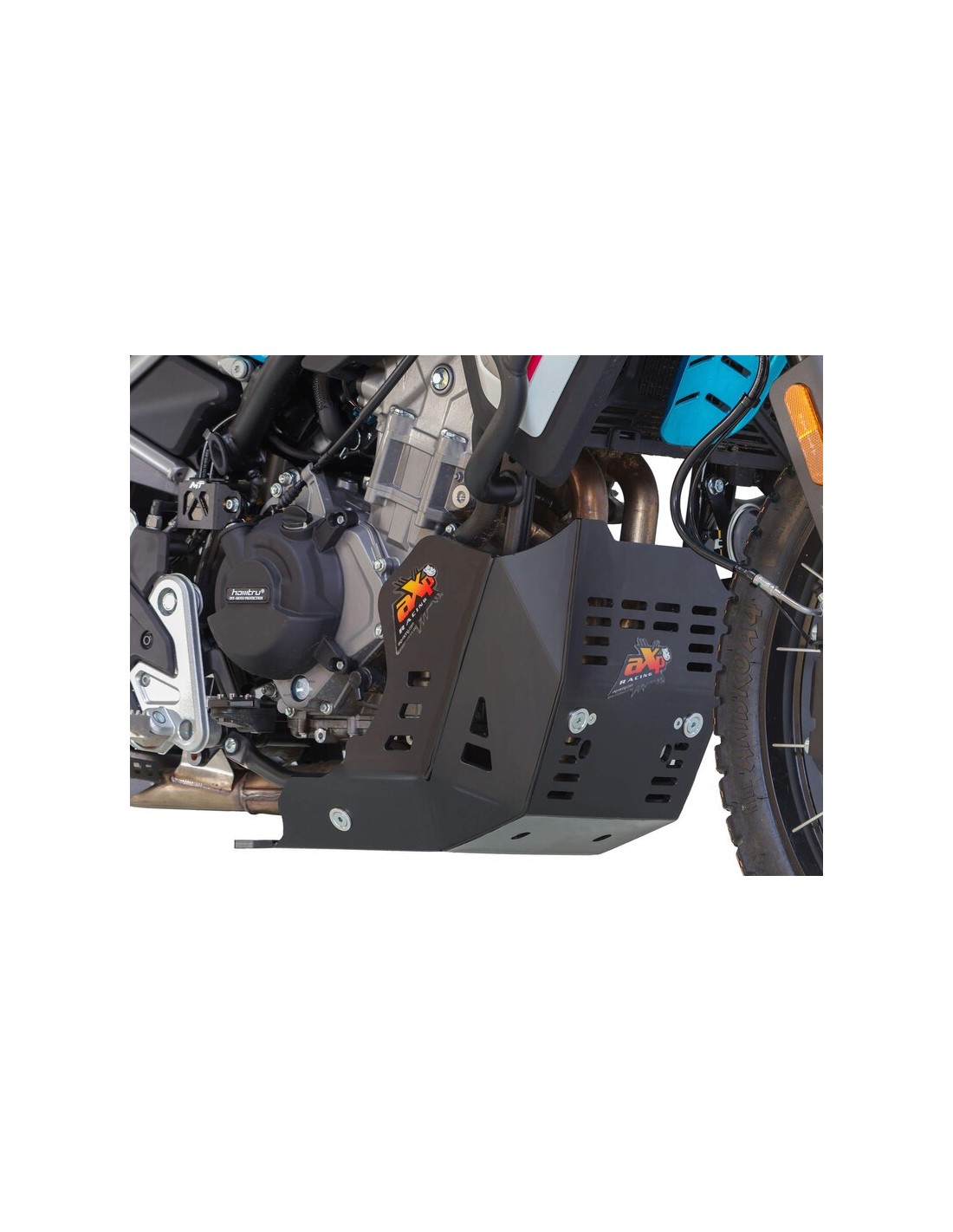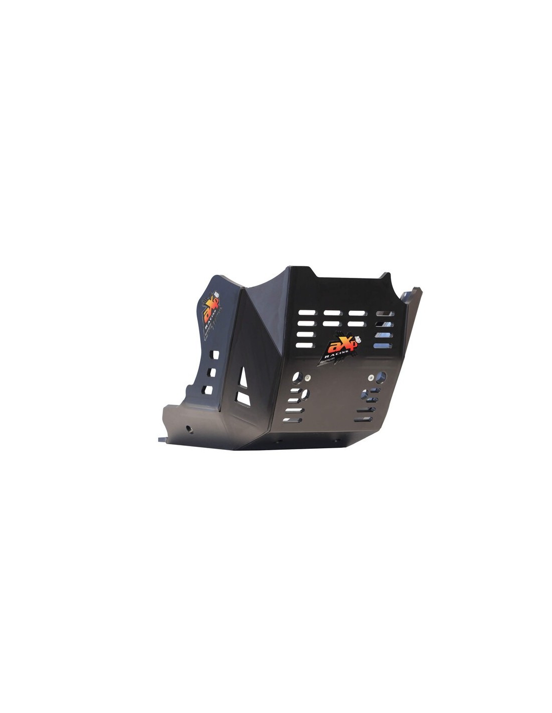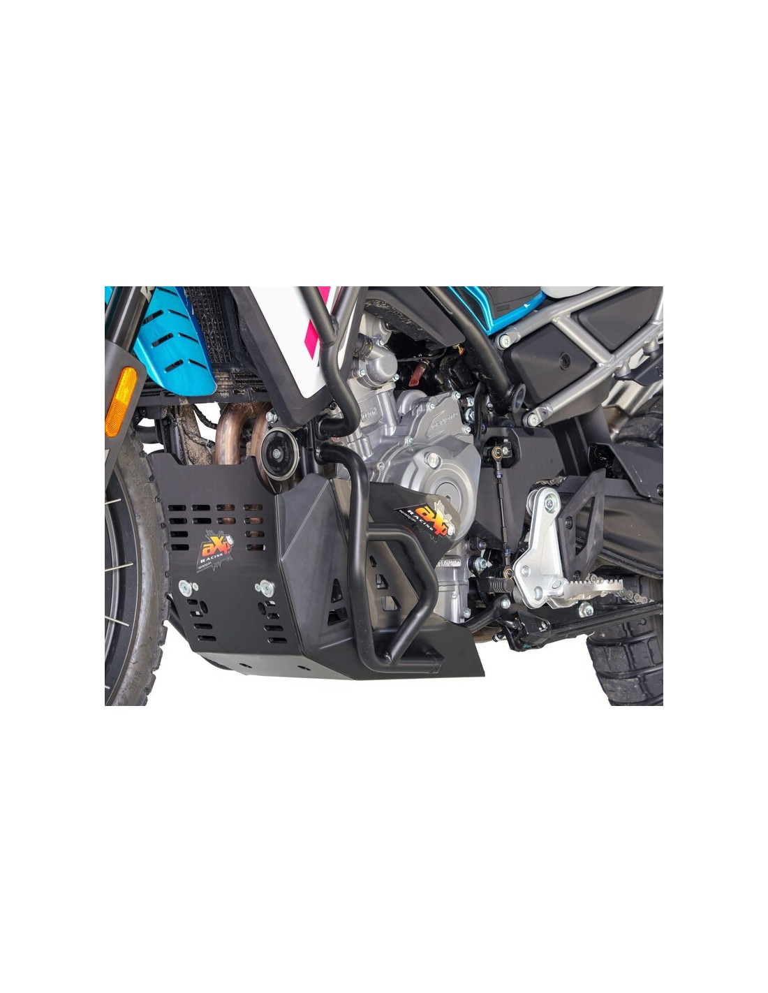 Adventure skid plate for CFMOTO MT450 / IBEX450 - Weight: 2.2kg - Made from 8mm-thick high-density polyethylene plastic, the AXP skid plate offers a complete protection to your motorcycle, from the water pump and engine block to the exhaust system and case. High-density foams are supplied to stick on each side of the skid plate to prevent friction with the water pump and case. Designed to fit your bike WITH or WITHOUT the original crash bars, thanks to fasteners placed directly in the frame. The linkage guard is sold separately under reference AX1774.