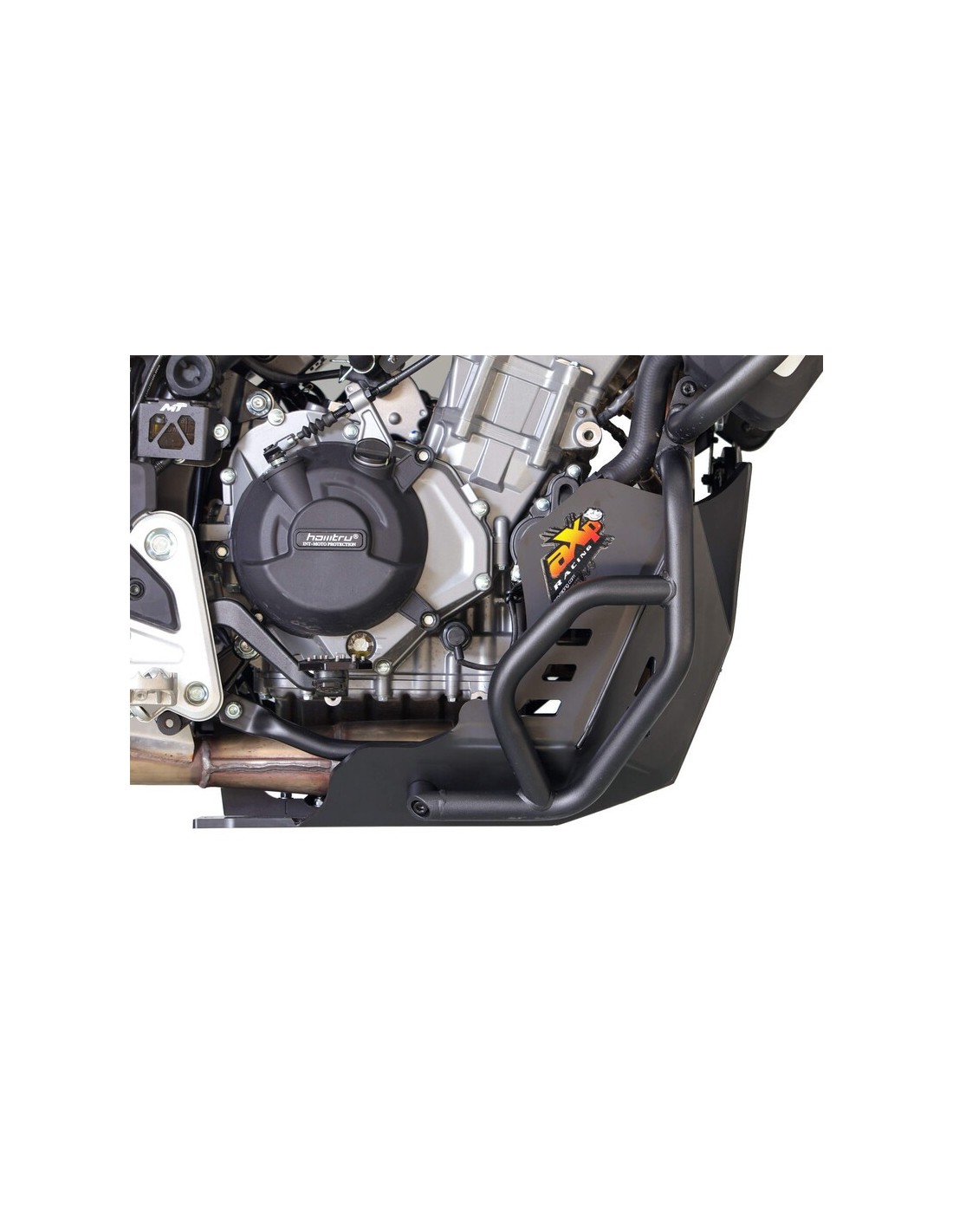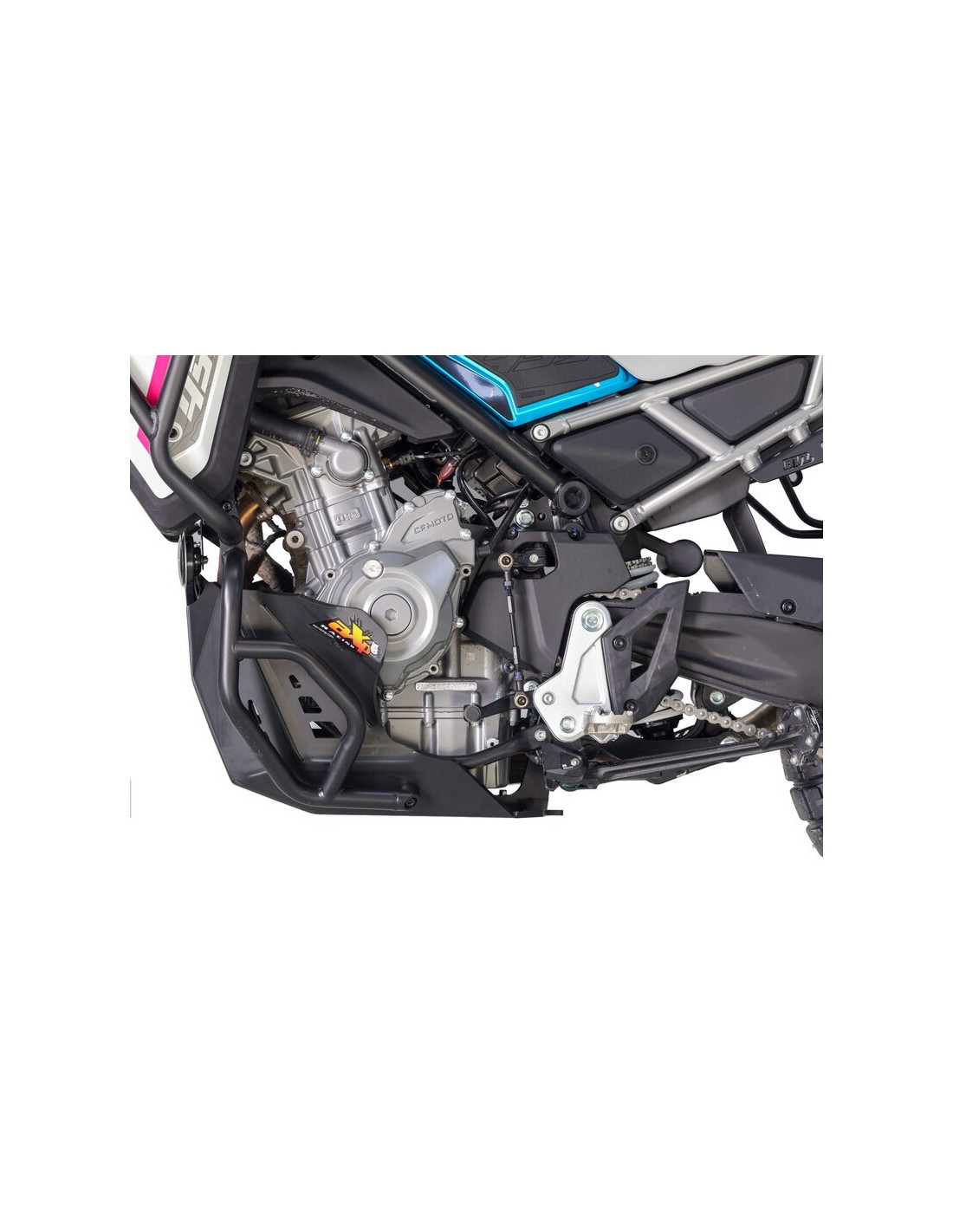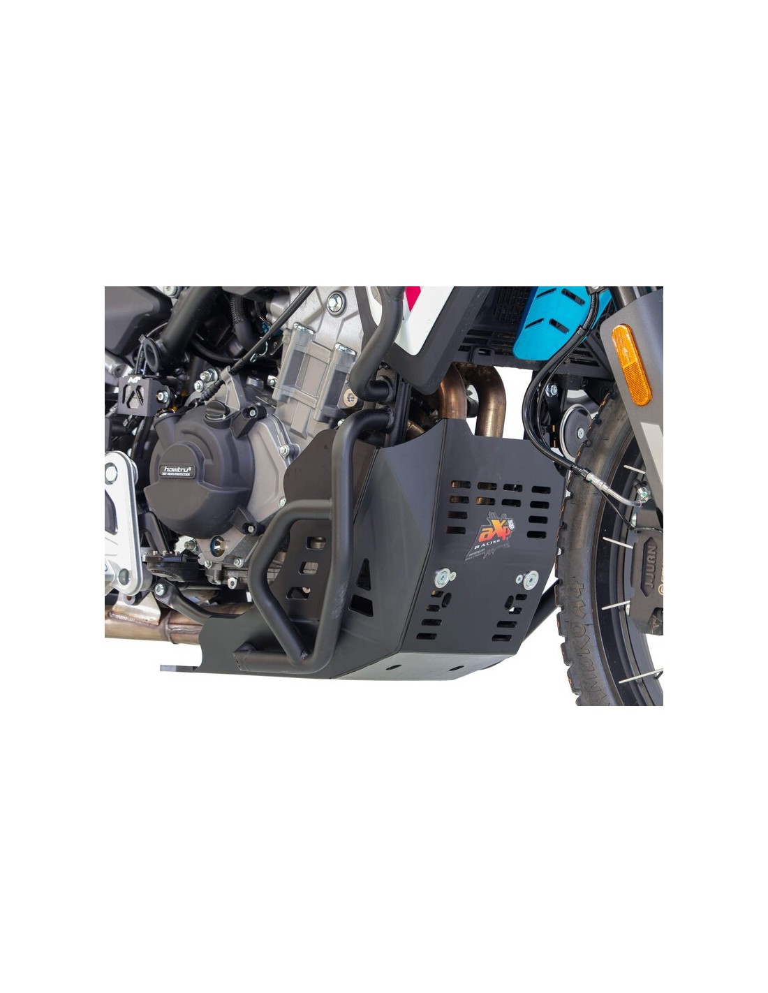 Adventure skid plate for CFMOTO MT450 / IBEX450 - Weight: 2.2kg - Made from 8mm-thick high-density polyethylene plastic, the AXP skid plate offers a complete protection to your motorcycle, from the water pump and engine block to the exhaust system and case. High-density foams are supplied to stick on each side of the skid plate to prevent friction with the water pump and case. Designed to fit your bike WITH or WITHOUT the original crash bars, thanks to fasteners placed directly in the frame. The linkage guard is sold separately under reference AX1774.