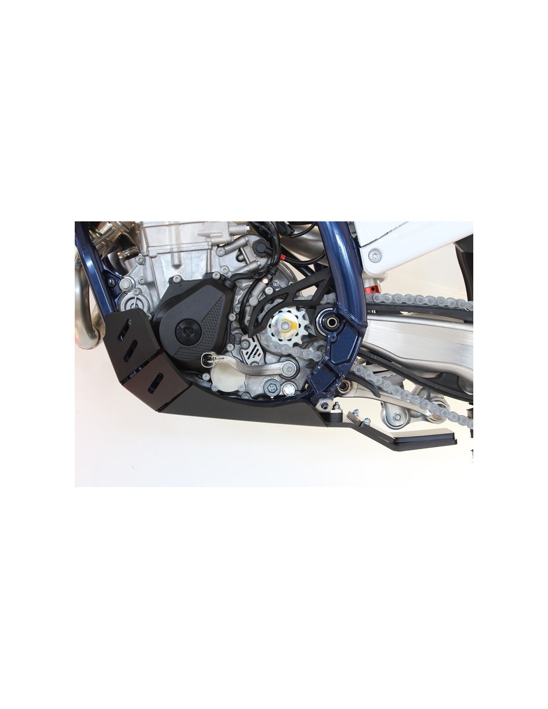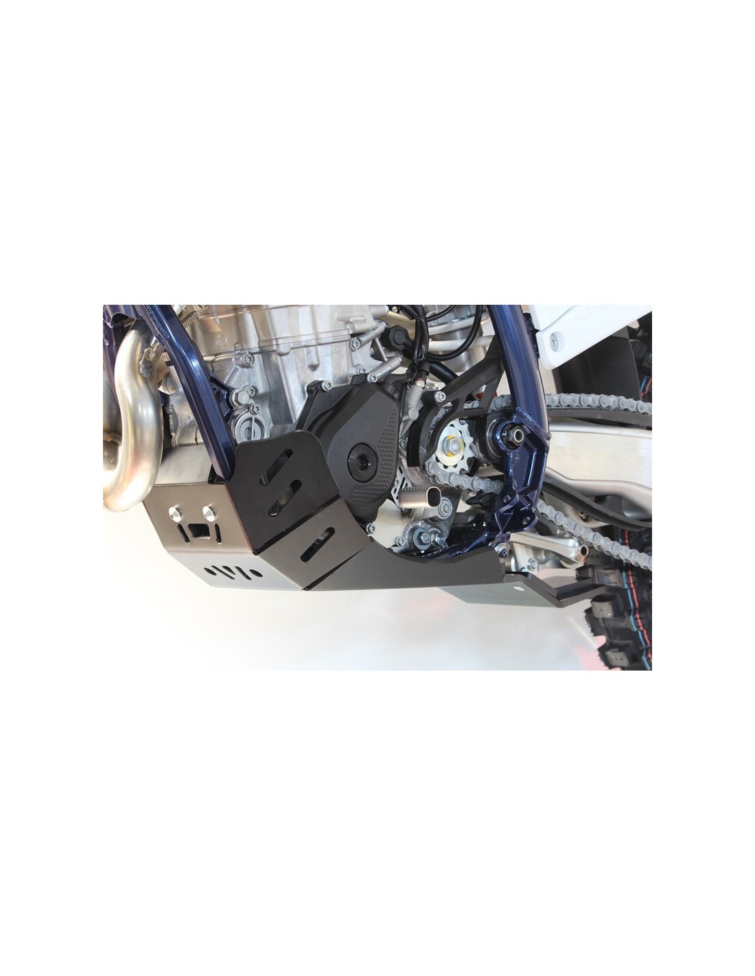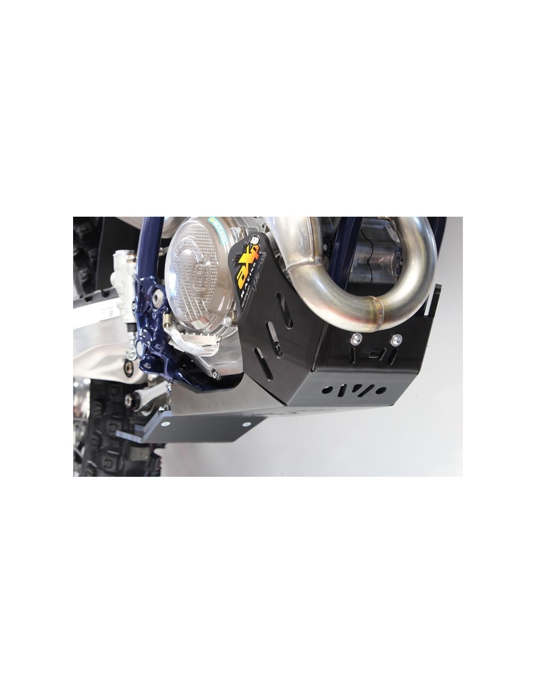 Made of HDPE 8mm thick plastic, the Xtrem bash plate will cover your full frame until the footpegs, protect the water pump, cases and the linkage . The Polyehtylen plastic is 30-40% lighter than a similar alloy skid plate. Does no generate vibrations and does not undergo the deformations. It will be also more resistant than carbon fiber skid plates.