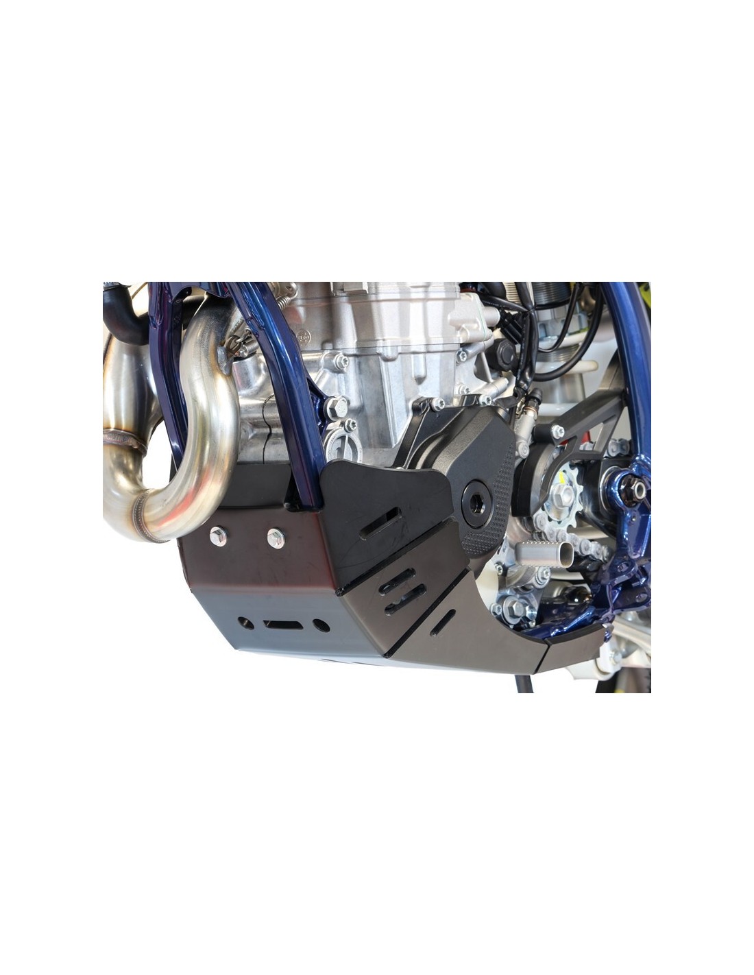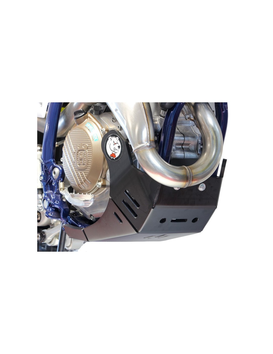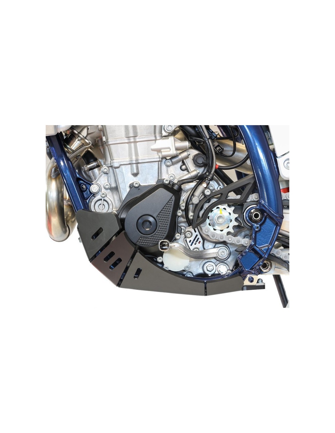 - El cubrecárter AXP Racing envuelve el chasis hasta la parte inferior de las estriberas , cubre las maletas y protege la bomba de agua.