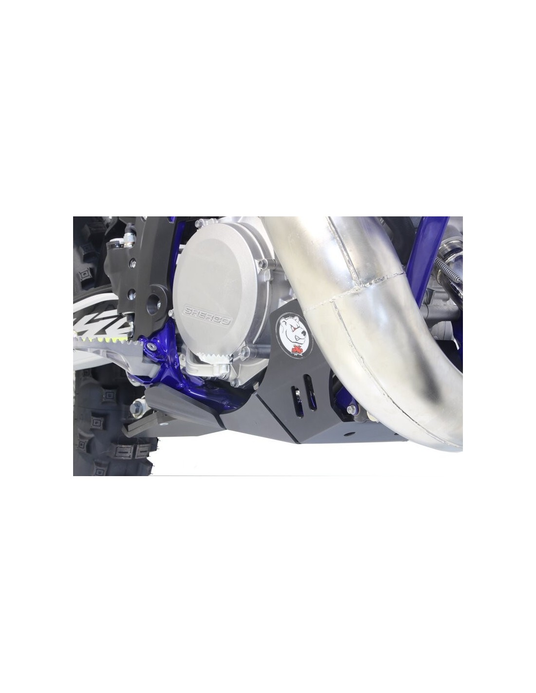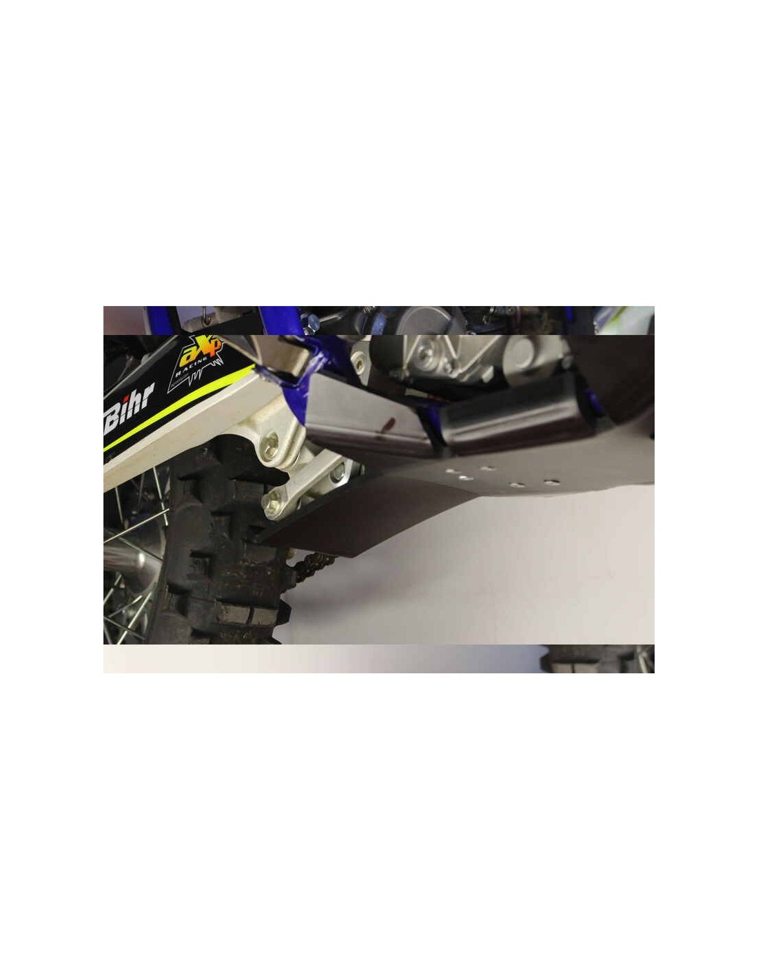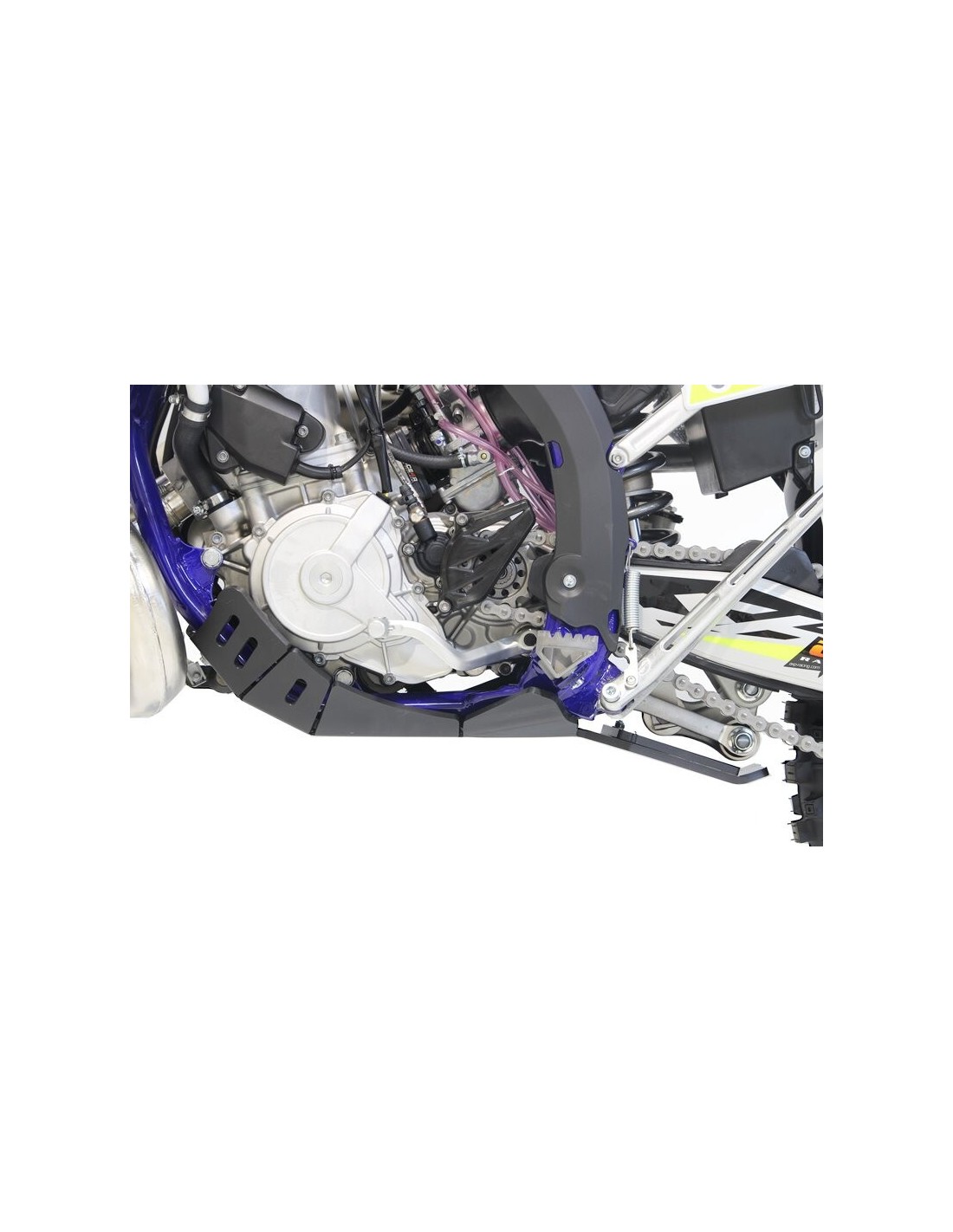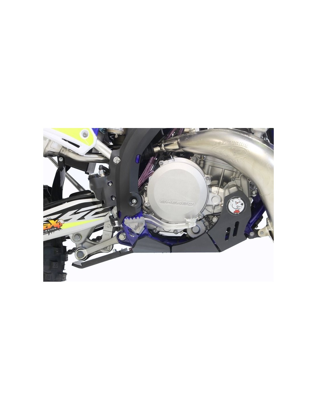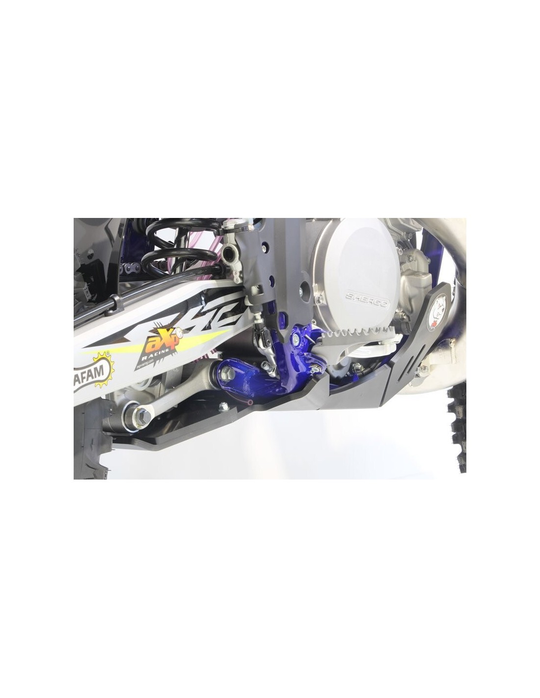 El cubrecárter Xtrem AXP Racing tiene un diseño diferente al de la línea MX/SX. Este modelo integra una protección integral del chasis hasta debajo de las estriberas.