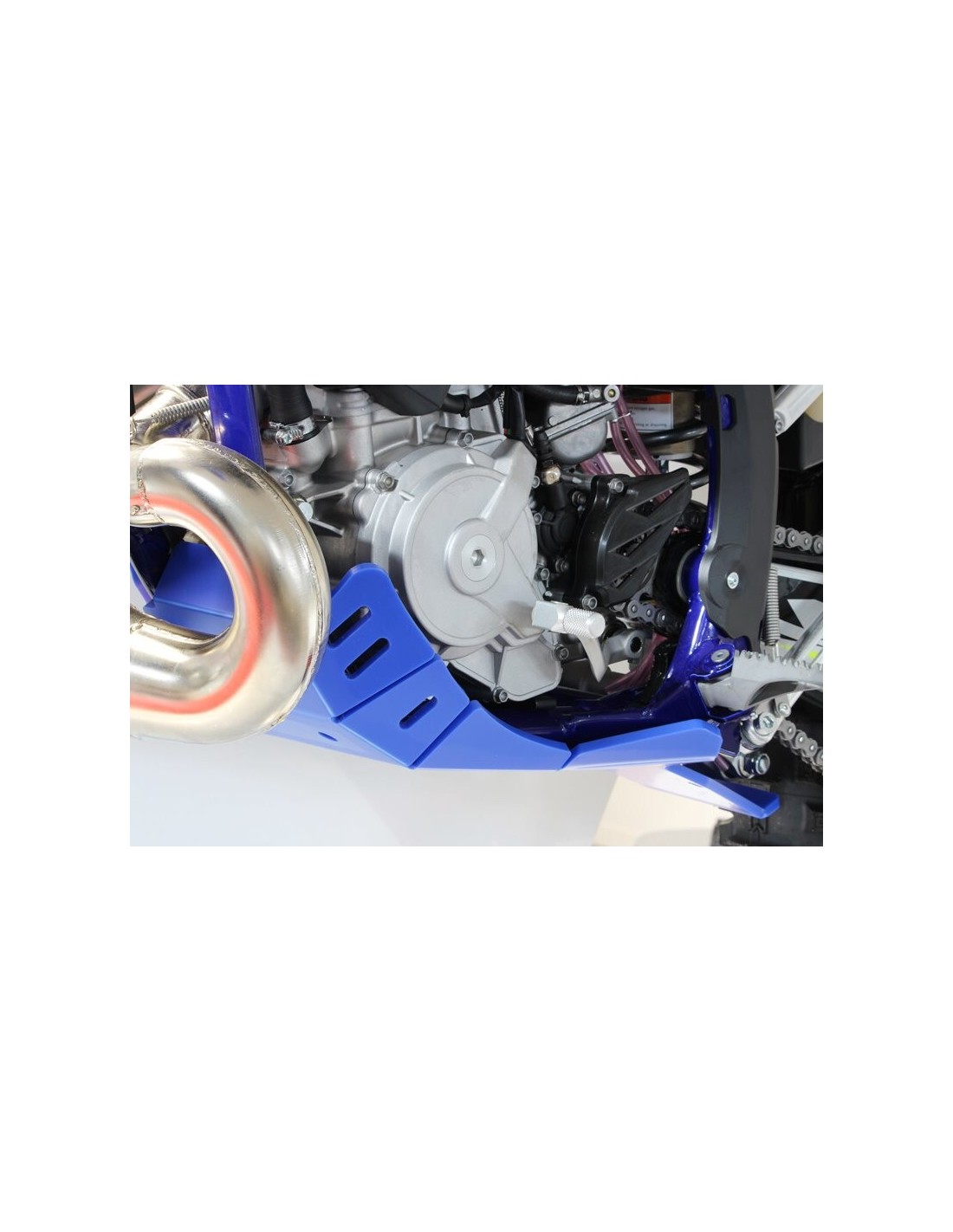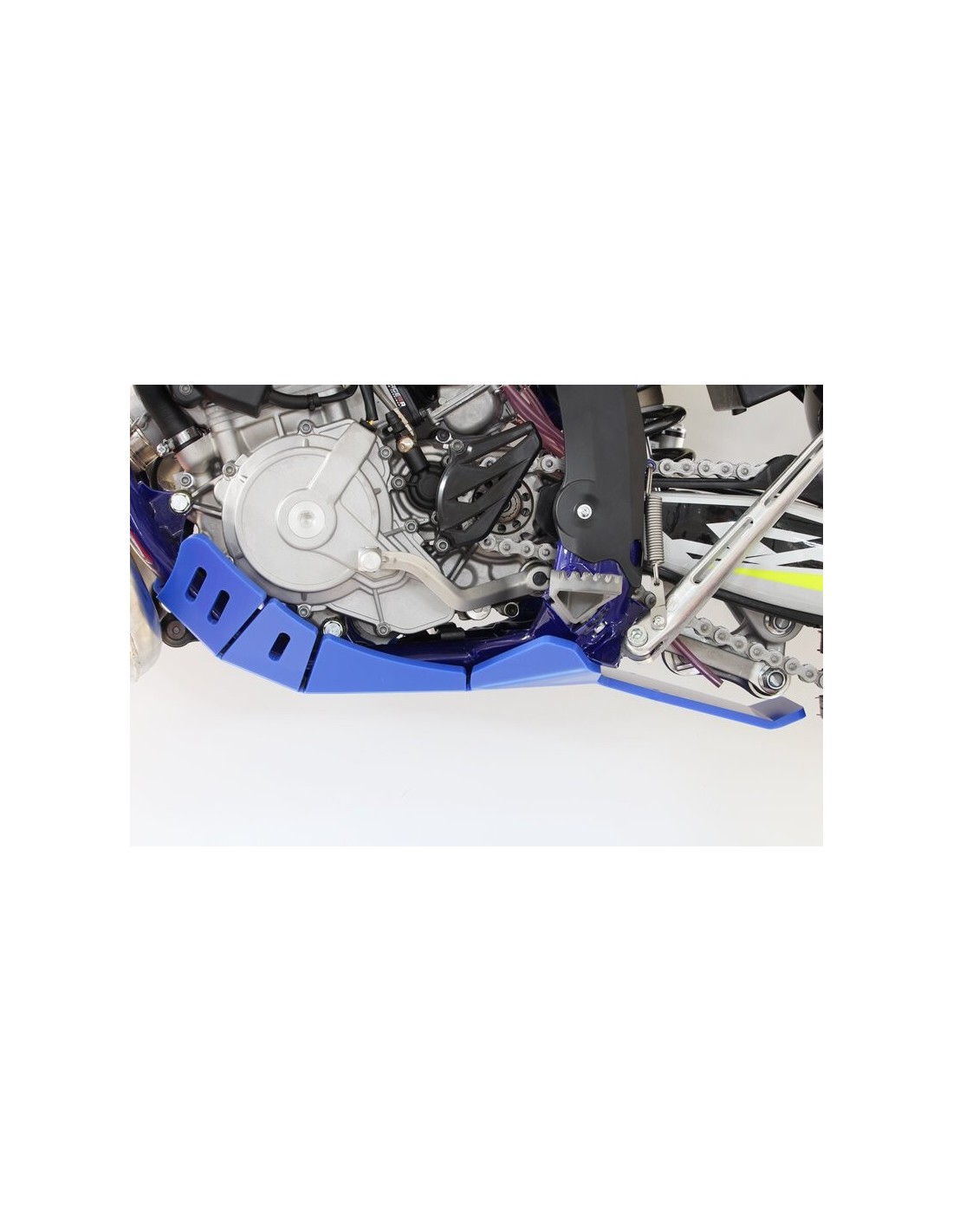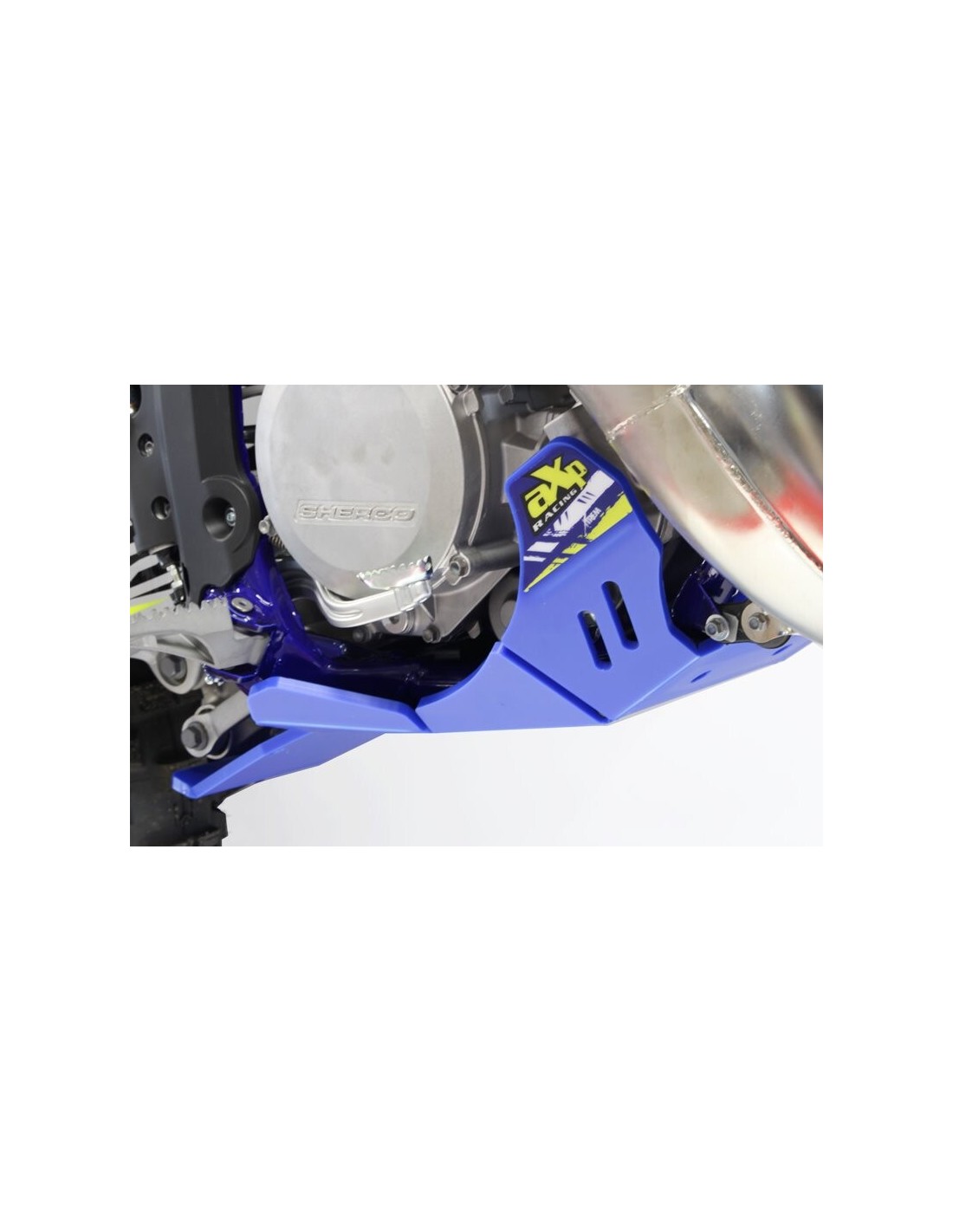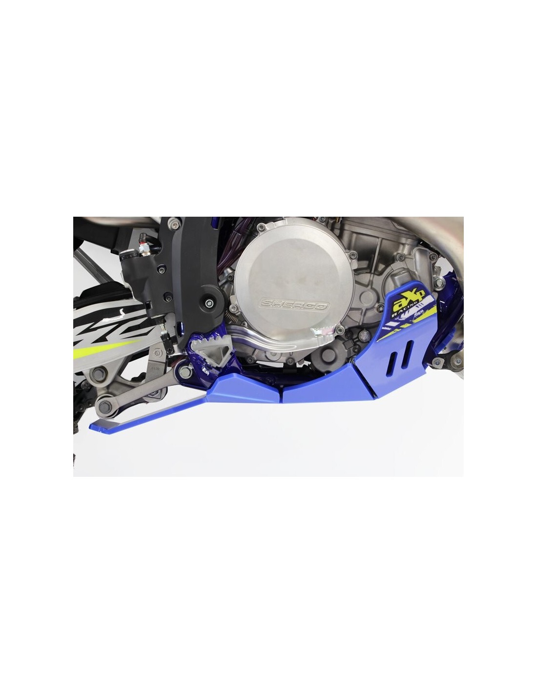 El cubrecárter Xtrem AXP Racing tiene un diseño diferente al de la línea MX/SX. Este modelo integra una protección integral del chasis hasta debajo de las estriberas.