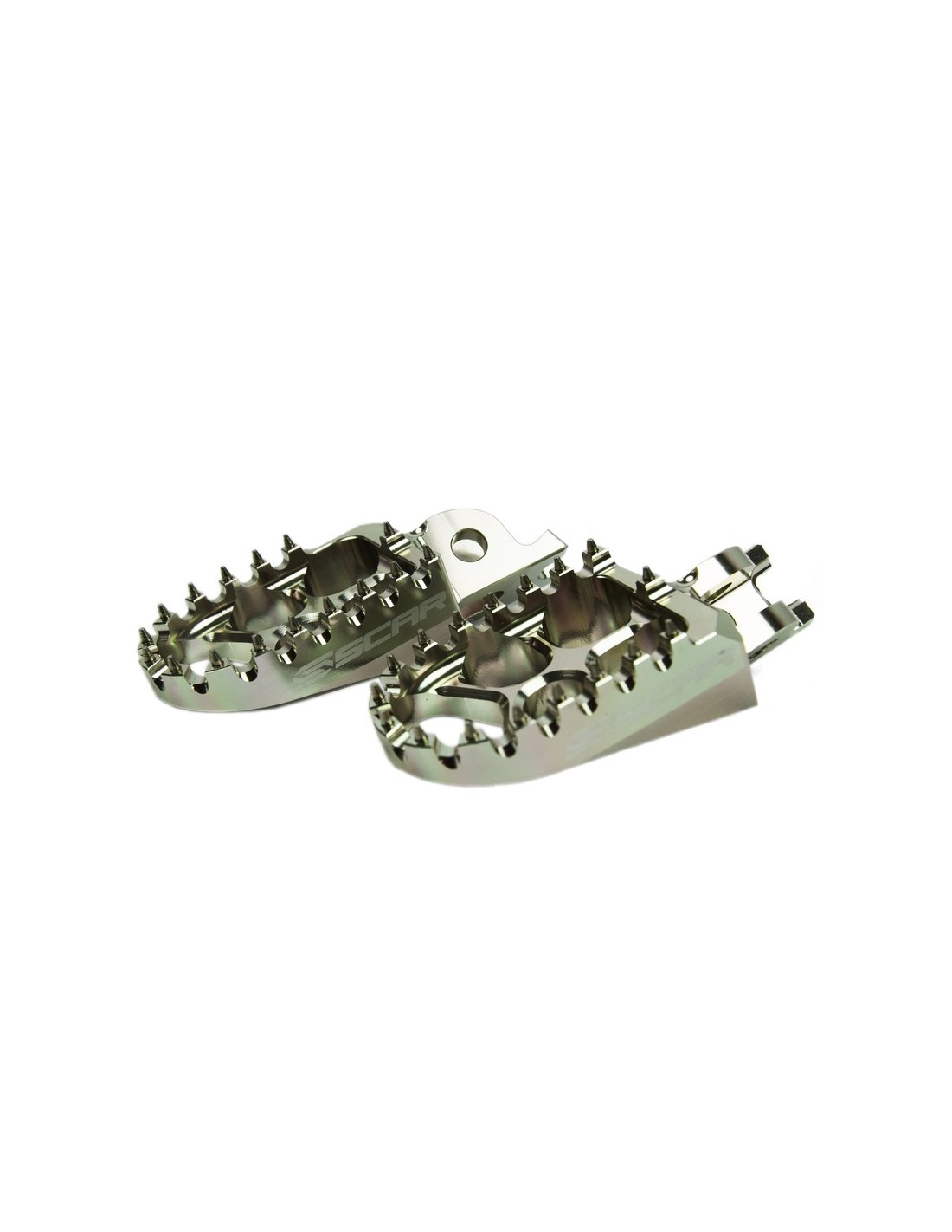 Scar foot pegs have been developed with competition teams. Made by numerical control from an aluminium used in aeronautics, they are 40% lighter and 20% stronger than standard OEM foot pegs.