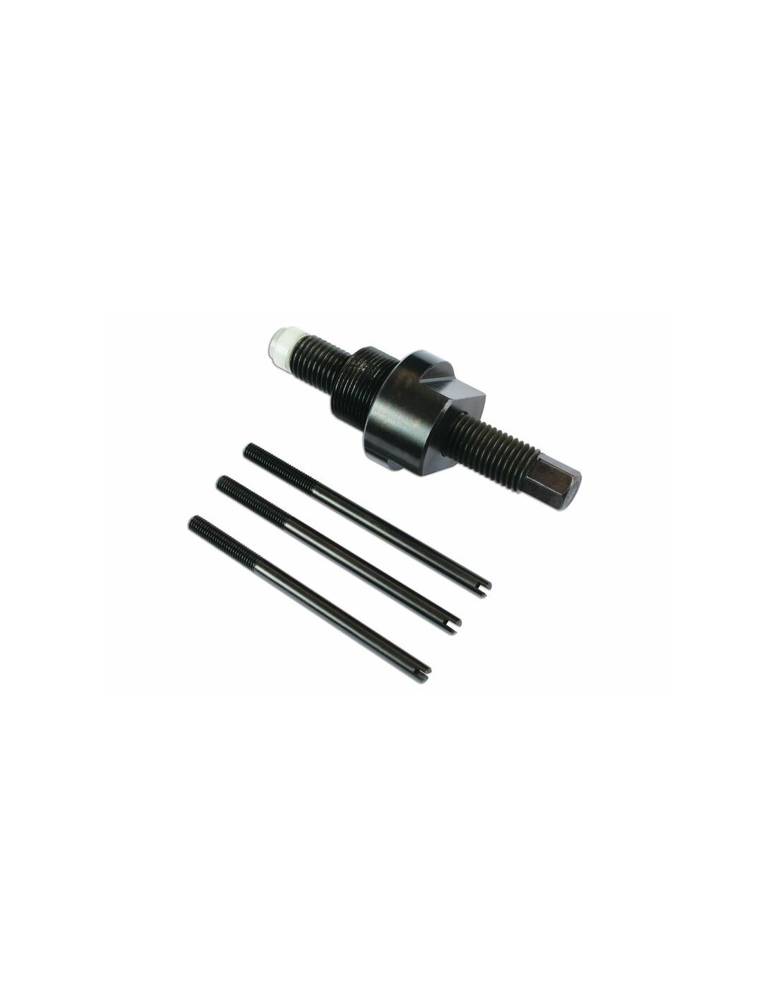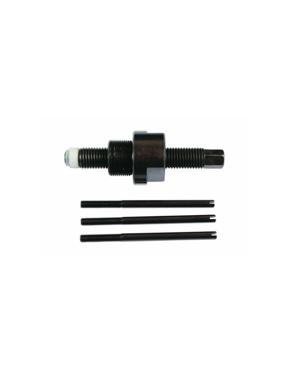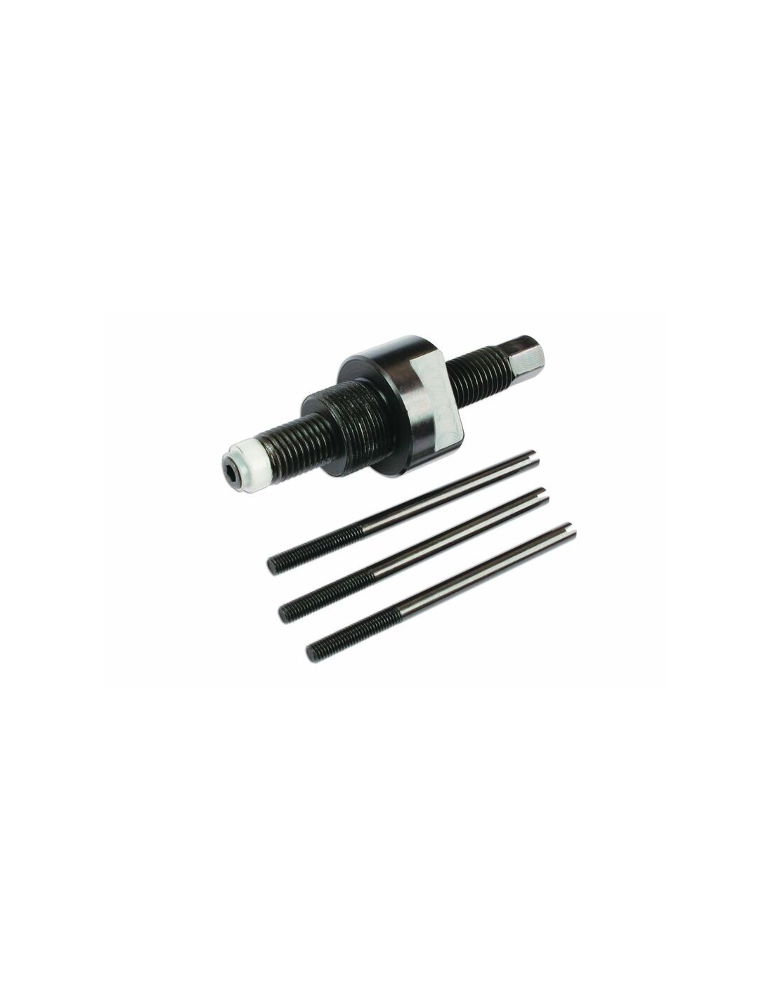 El campo magnético presente en el alternador es bastante fuerte y, por tanto, requiere el uso de un extractor de este tipo para extraer la tapa del alternador. Se suministra con tres innovadores pasadores, para asegurar una extracción y colocación correctas de la tapa. El tornillo de fuerza permite una acción suave y progresiva para poder extraer la tapa de forma perpendicular, y el cabezal especial de plástico presenta una forma especial para prevenir daños en el cigüeñal y la tuerca del eje.