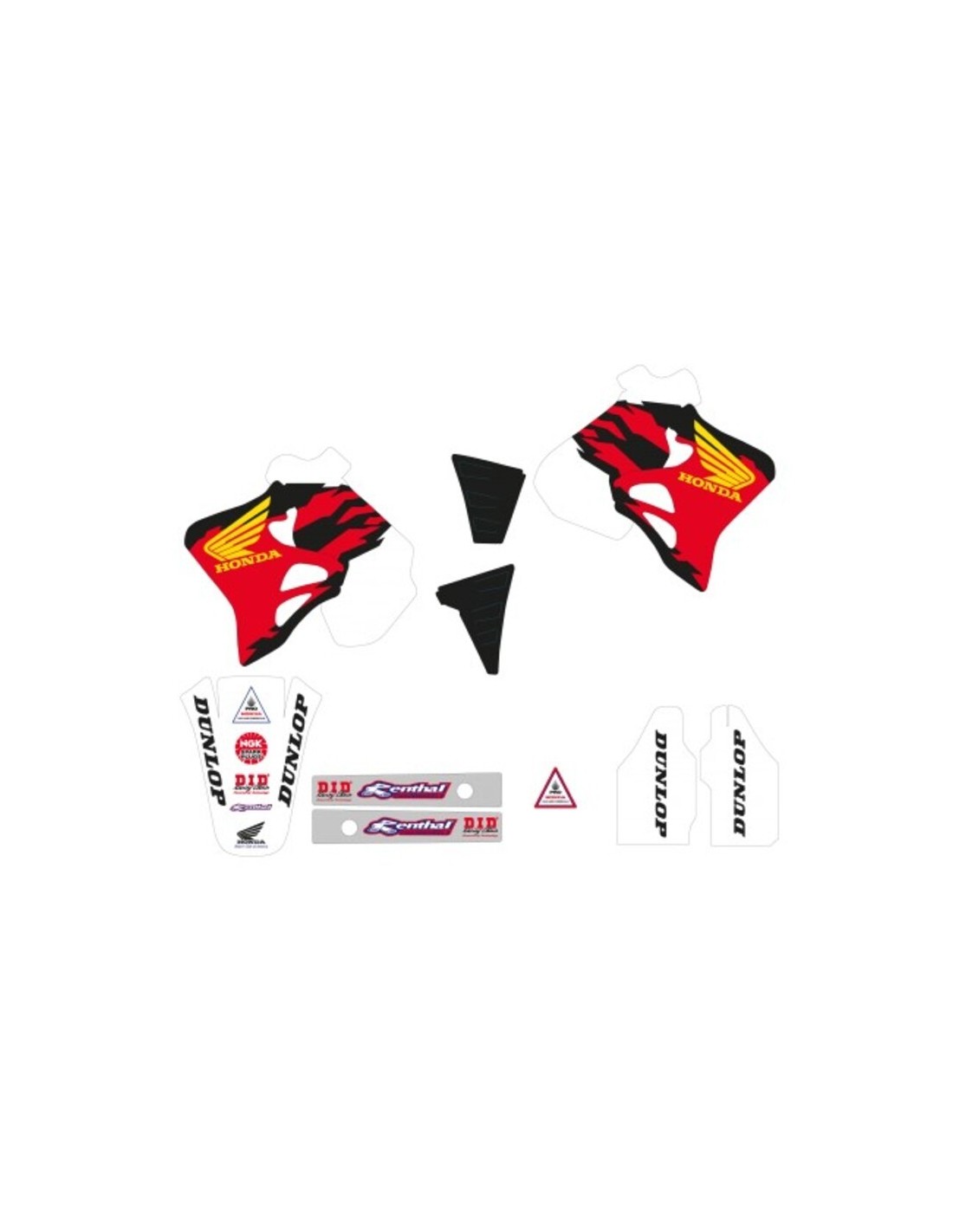 The sticker kit includes: tank pair, radiator shrouds pair, airbox pair, number plates, fork protections pair, swing arm pair, front fender and rear fender.