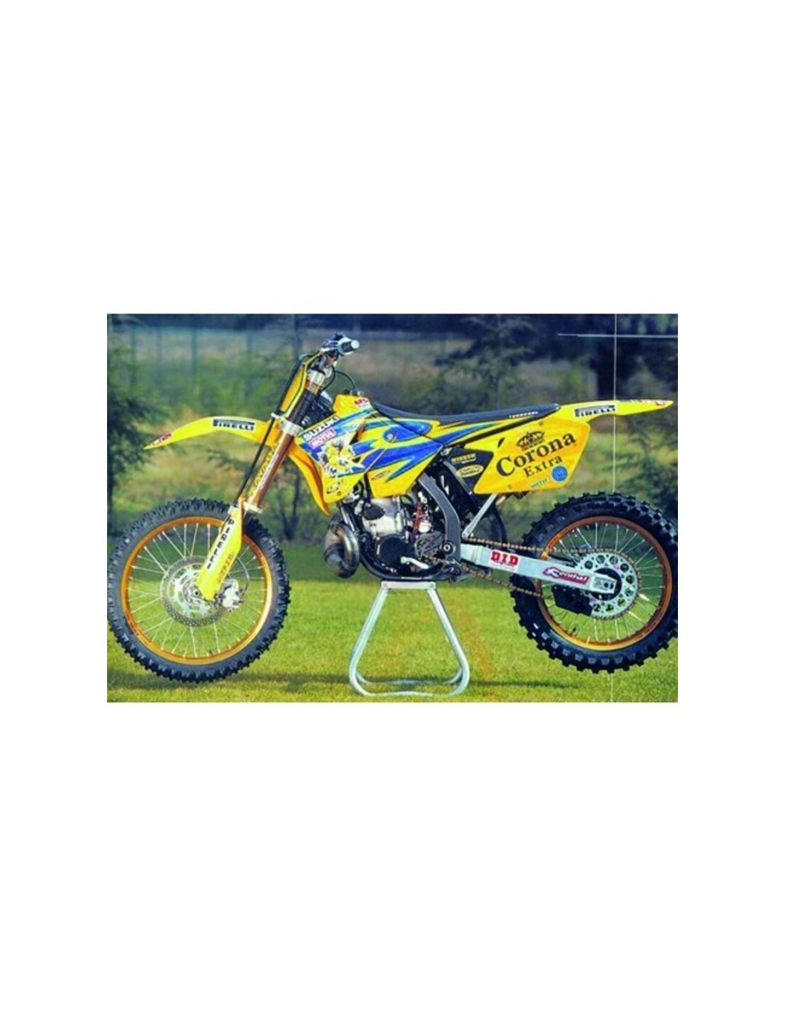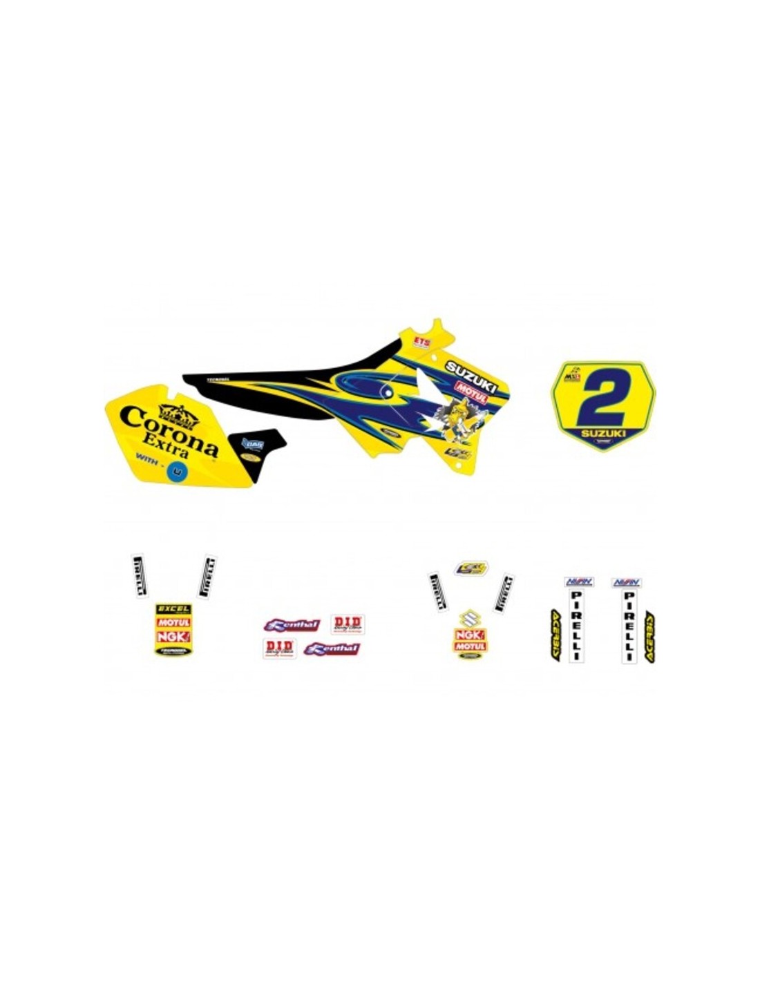 The sticker kit includes: tank pair, radiator shrouds pair, airbox pair, number plates, fork protections pair, swing arm pair, front fender and rear fender.