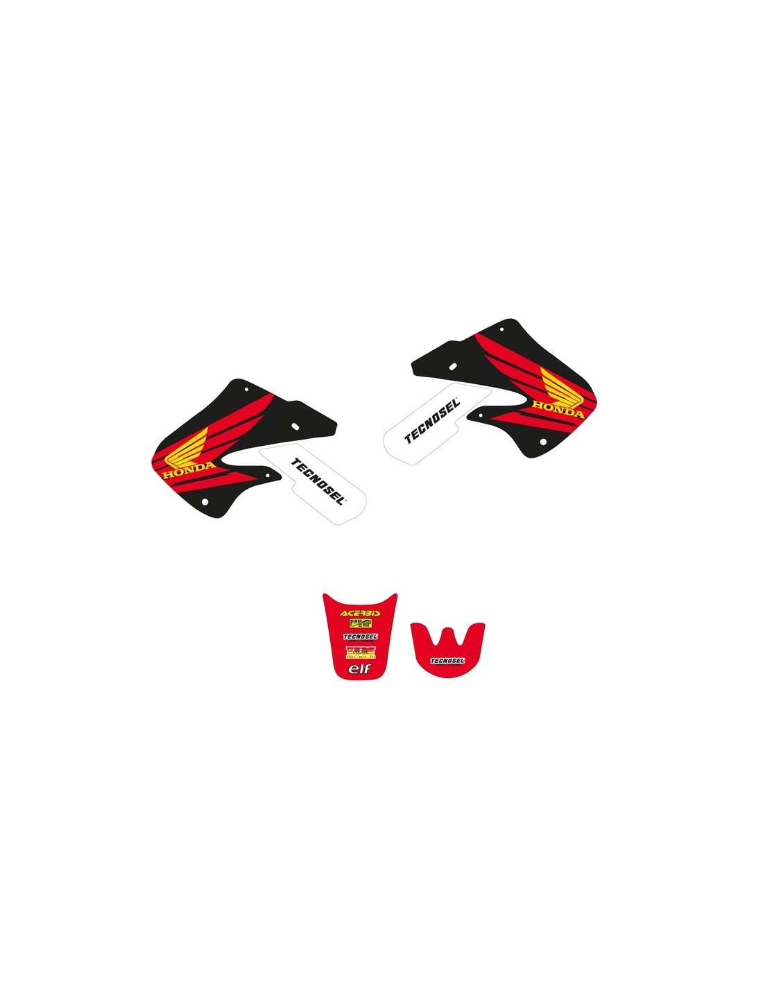 The sticker kit includes: tank pair, radiator shrouds pair, airbox pair, number plates, fork protections pair, swing arm pair, front fender and rear fender.