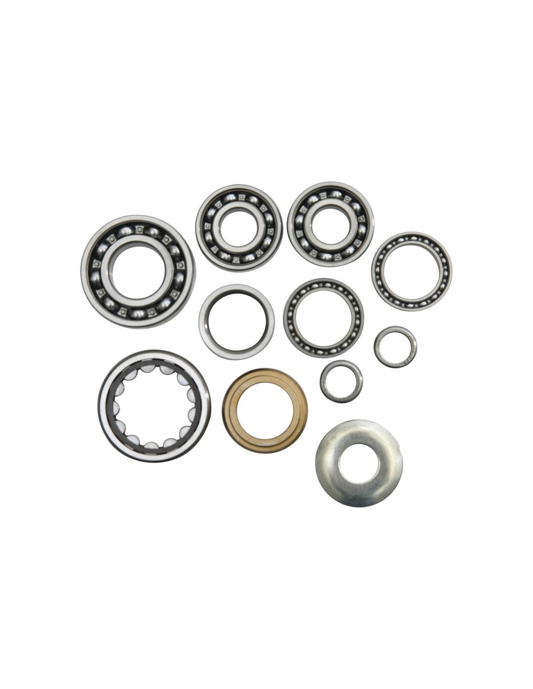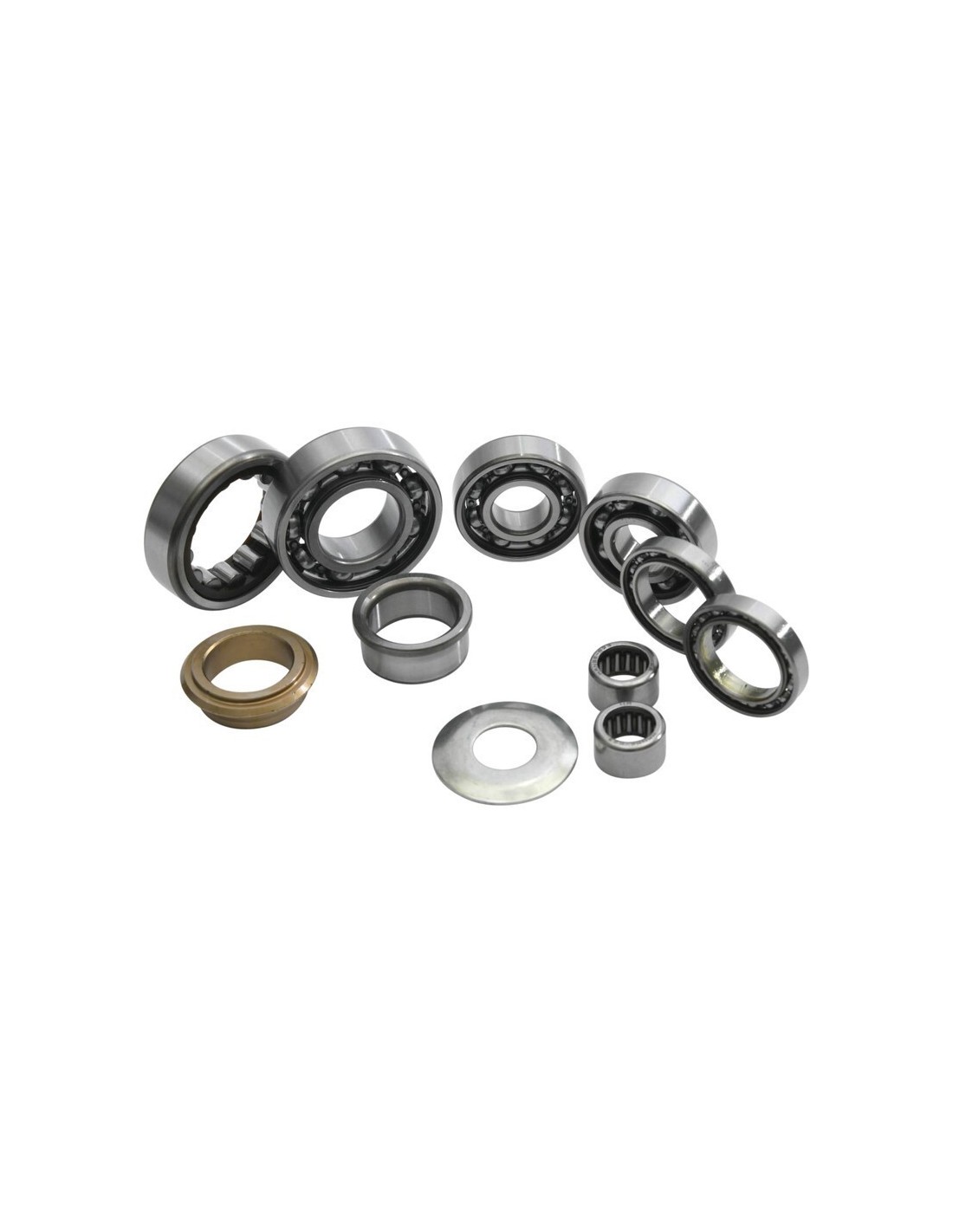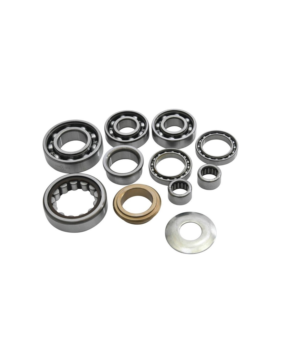 Incluye: Rodamientos del eje primario, rodamientos del eje secundario, rodamientos del eje de cambio, rodamientos del tambor de cambio, casquillo del eje de salida y arandela.