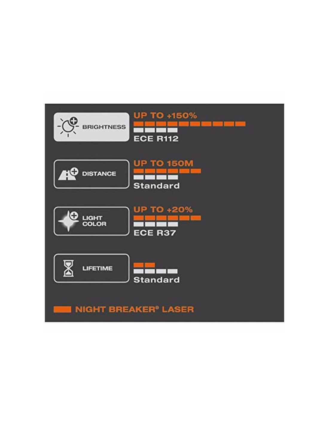 Discover the next generation of NIGHT BREAKER LASER - the brightest halogen automotive light from OSRAM! Using an innovative laser ablation technology these headlight lamps shine up to 150% brighter compared to the minimum legal standard. The highly engineered filament ensures an extra light output. Thus, the lamps provide an up to 150 meter long beam and up to 20% whiter light compared to the minimum legal standard. More light and improved visibility can help drivers identify and react to traffic hazards more quickly. And last but not least - OSRAM NIGHT BREAKER LASER convinces with its unique design with laser-etched product name and a complete portfolio (H1, H3, H4, H7, H8, H11, HB3, HB4). The ideal lamp for drivers who know the difference that powerful automotive lighting makes!