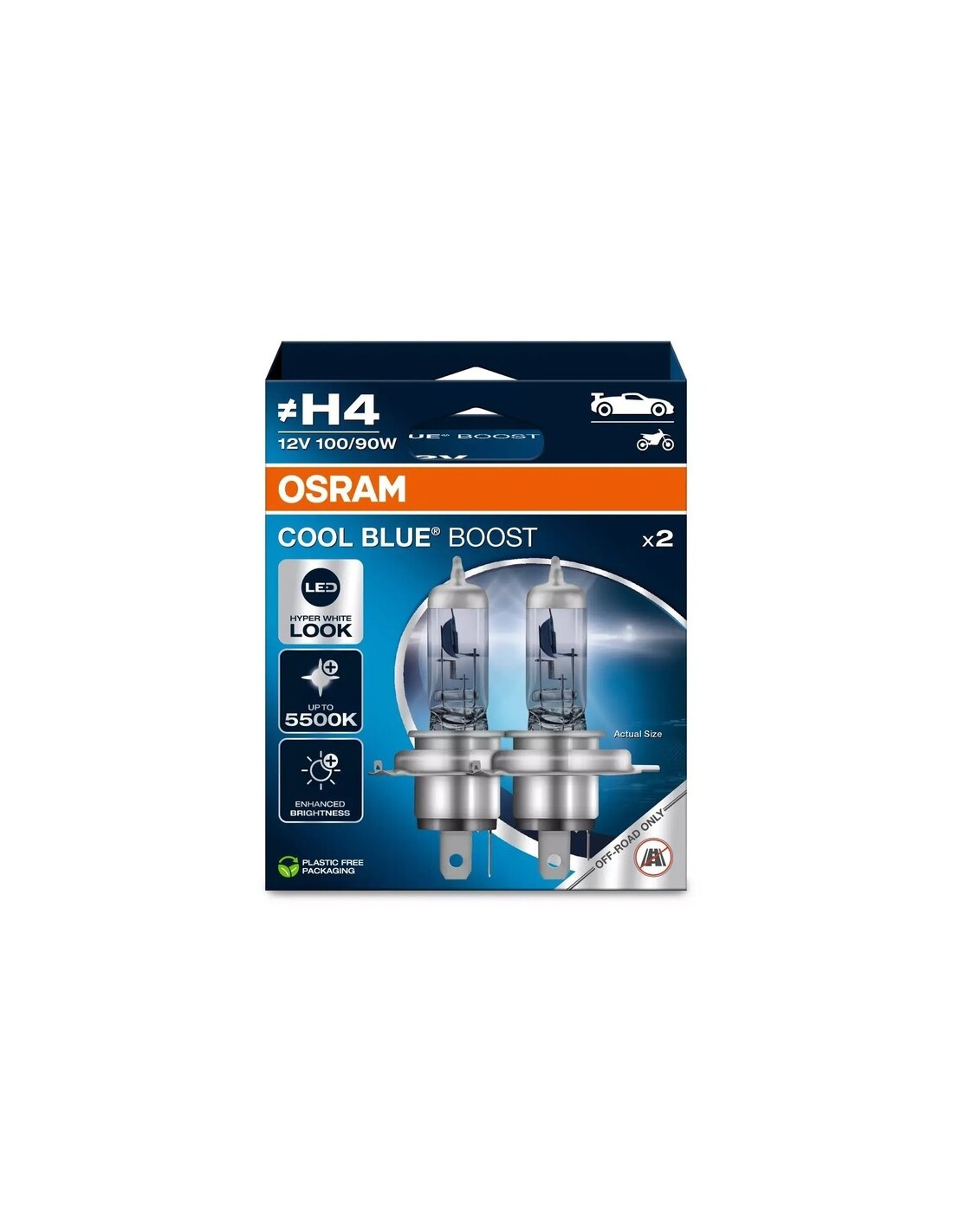 COOL BLUE BOOST tiene una luz halógena súper blanca con aspecto de LED y altas temperaturas de color de hasta 5.500 K. Las lámparas generan una mayor luminosidad. Estos productos no están homologados por la CEE. Esto significa que no deben utilizarse en la vía pública en ninguna aplicación exterior. Su uso en la vía pública supondrá la anulación de la licencia de explotación y la pérdida de la cobertura del seguro. Muchos países no permiten la venta y el uso de estos productos. Póngase en contacto con su distribuidor local para obtener información sobre la disponibilidad en su país.