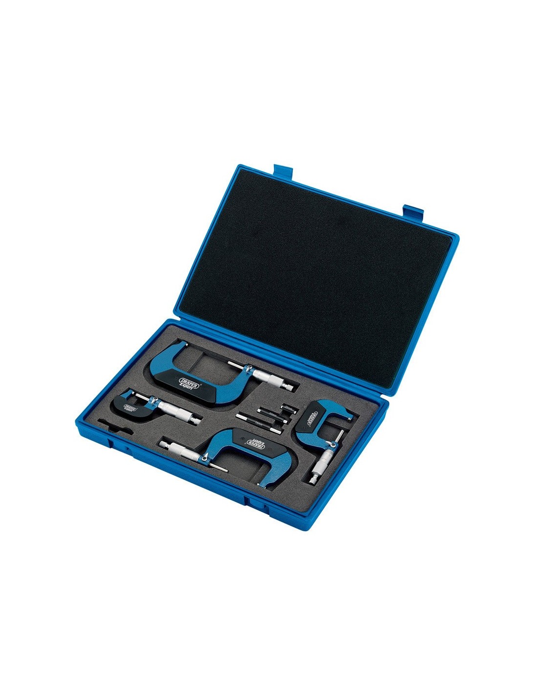 Kit de micrómetro de exteriores, con superficie de medición controlada por carraca y sistema de bloqueo (4 unidades) Precisión: 0'01 mm (1/100 pulgadas). Contiene: Micrómetro, capacidad 0 - 25 mm. Micrómetro, capacidad: 25 - 50 mm. Micrómetero, capacidad: 50 - 75 mm. Micrómetro, capacidad 75 - 100 mm.""""
