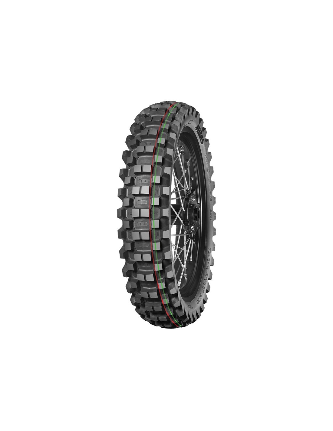 Es reconocible por sus características franjas verdes y rojas y está igualmente disponible en medidas Junior y Pitcross MX. Se trata de un neumático NHS (no apto para circular por vías públicas).