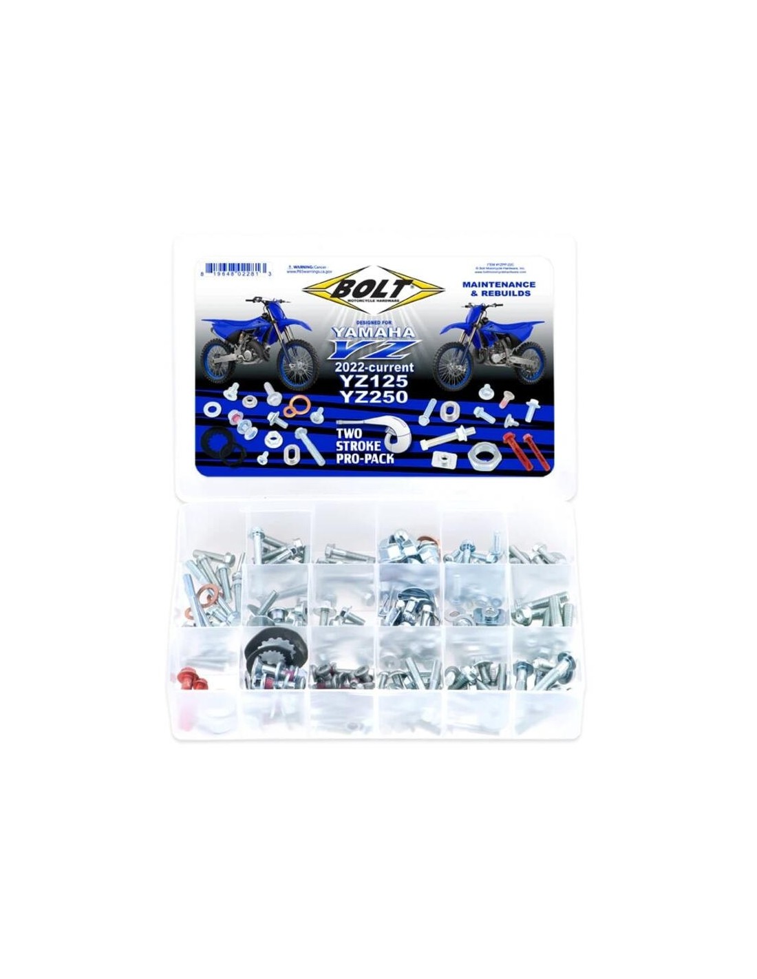 Nuestro kit Two-Stroke Pro-Pack son para la generación actual YZ125/250 cuenta con lo necesario para una restitución completa de la plástica de su moto, tornillería externa para el motor, bujes de aluminio, tuercas de clip, pernos de disco de freno, un juego completo de pernos de corona, tuercas Fuji, y arandelas para tapón de vaciado. Incluye una guía de colocación para garantizar un ajuste. Excelente para proyectos de mantenimiento y reacondicionamiento. Apto para YZ 125cc & 250cc de años 2022 a la actualidad.