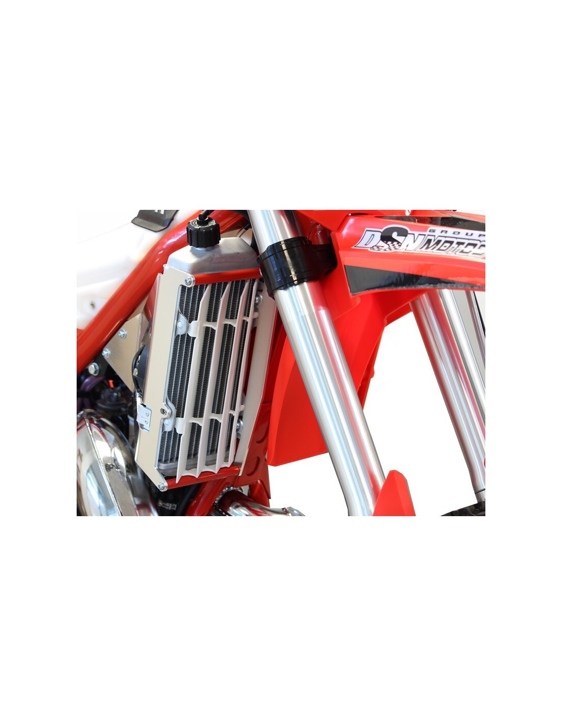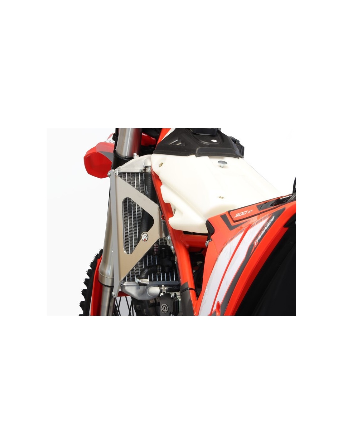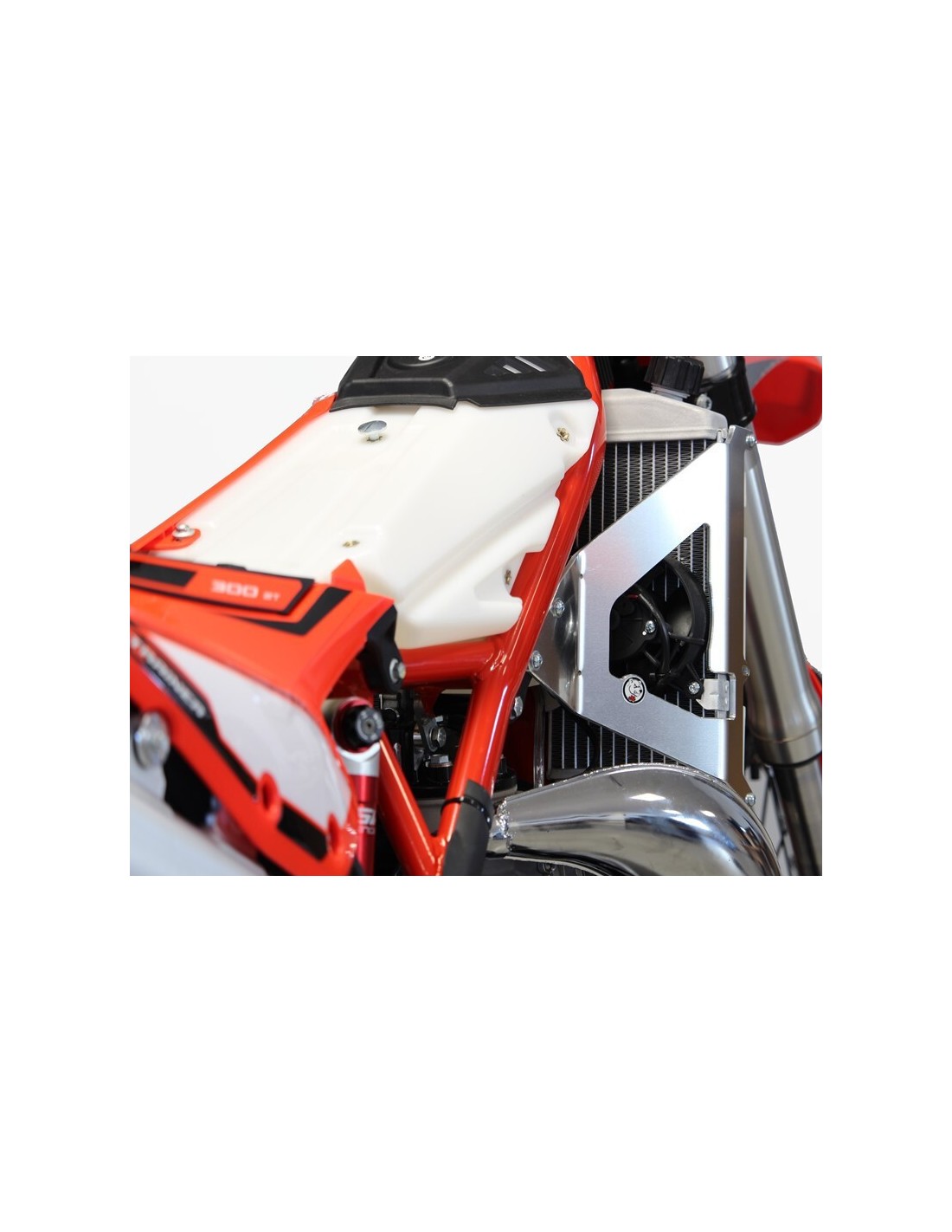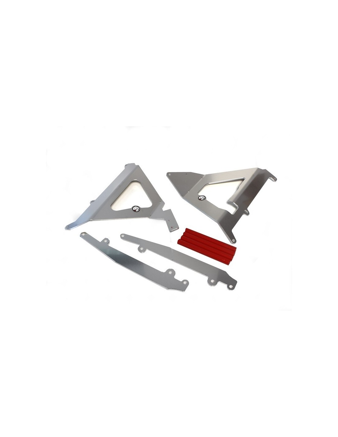 Fabricadas en aluminio de 4 mm de grosor, las protecciones forman una auténtica jaula alrededor de los radiadores con un punto de fijación adicional contra el bastidor para reforzar la resistencia en caso de caída. Estos productos permiten utilizar los deflectores de aire OEM sin ninguna modificación. Peso: 1,0Kg.