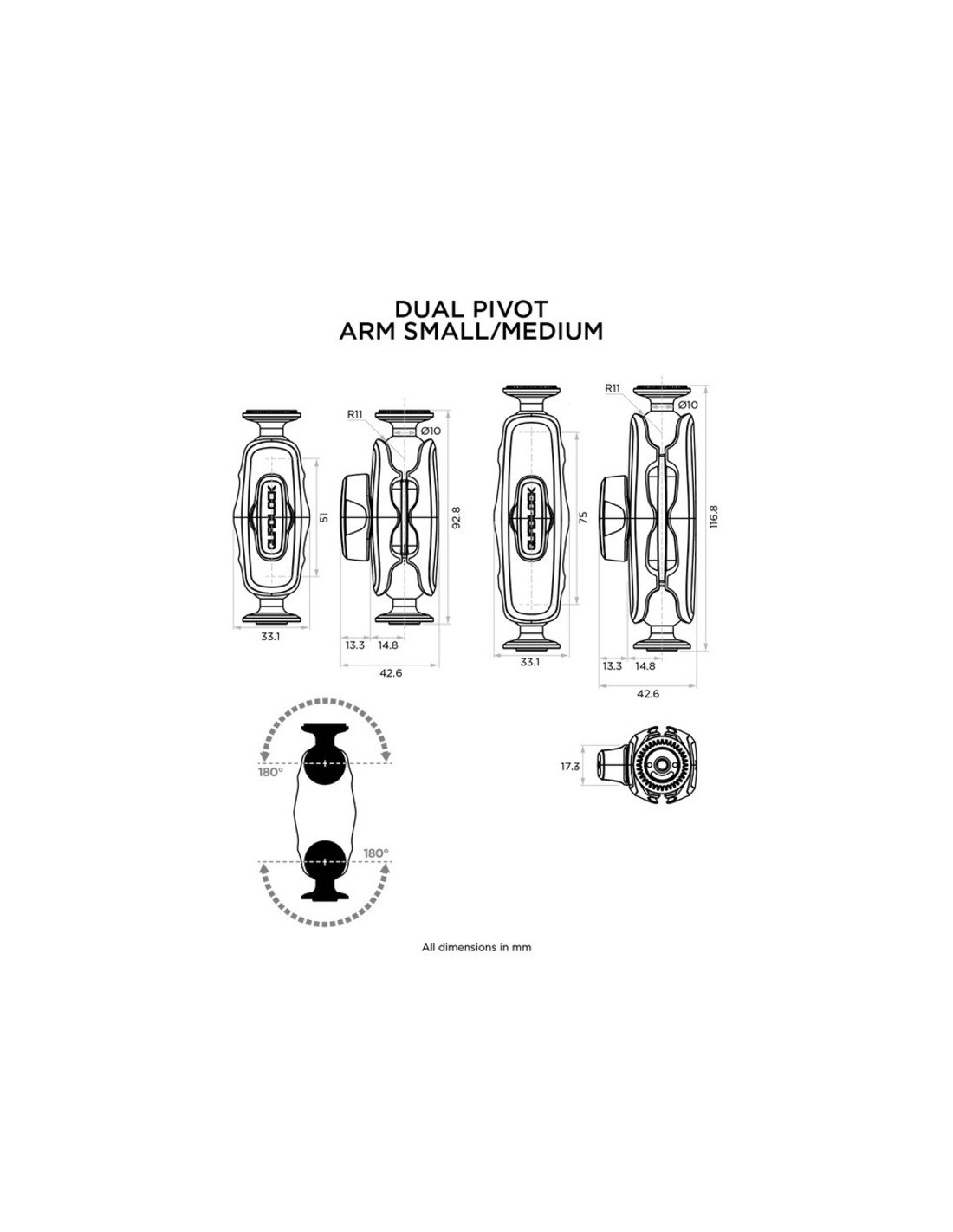 Elija entre las versiones de longitud pequeña (51mm / 2") o media (75mm / 3") para adaptarse a sus necesidades. Ambos brazos son compatibles con todos los cabezales y bases Quad Lock 360.