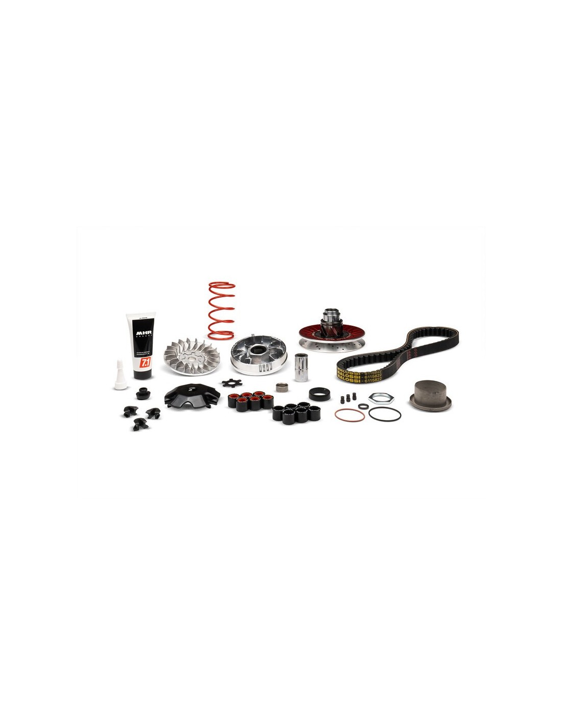 La pieza central del nuevo kit Malossi es el variador Multivar, en constante evolución, que viene acompañado por dos sets de rodillos para ajustar el funcionamiento de la transmisión según tus necesidades. Con la amplia gama de rodillos de variador disponibles en nuestro catálogo, las configuraciones son prácticamente infinitas.
