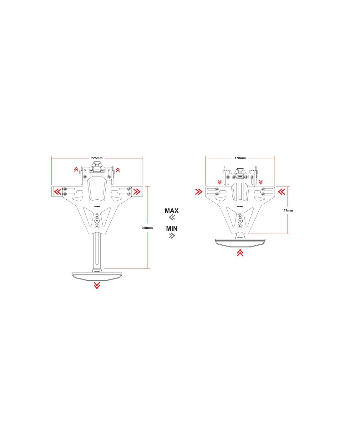 Los soportes de intermitentes AKRON-RS Pro son ajustables en anchura y, por tanto, adecuados para todo tipo de intermitentes accesorios. Esta opción de ajuste te permite adaptar la posición de los intermitentes a las matrículas más variadas. Los orificios de 10 mm están ranurados lateralmente para poder montar los intermitentes sin desconectarlos del mazo de cables.