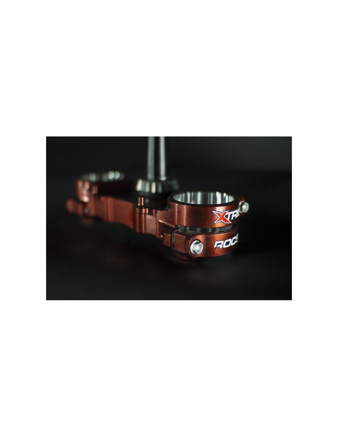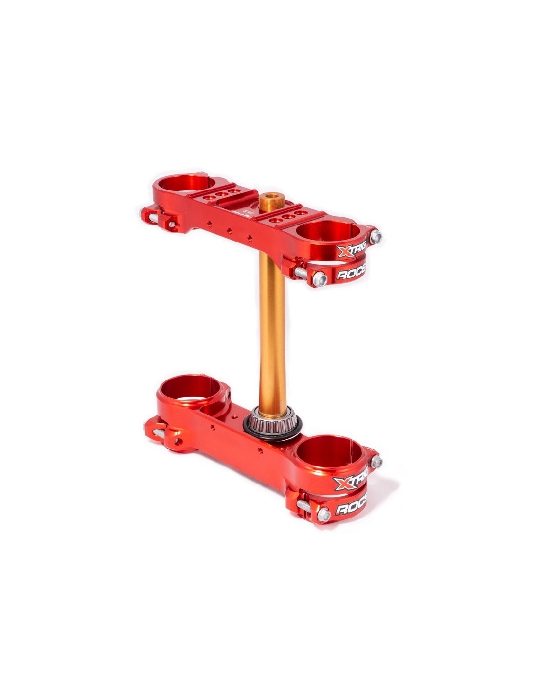 El sistema ROCS (Revolutionary Opposing Clamp System) ha sido uno de los desarrollos más espectaculares y elaborados de XTRIG en los últimos años. Las ventajas de este sistema en comparación con una abrazadera triple convencional son la menor deformación de los montantes de la horquilla en la zona de apriete, que tiene un efecto notable en la respuesta de la horquilla, pero también el diseño con las dos abrazaderas opuestas, que garantizan más seguridad contra la torsión de la horquilla por el efecto de autobloqueo. Otra ventaja es el hecho de que los tornillos de apriete no se influyen entre sí, por lo que se puede conseguir un par de apriete más preciso. Como no hay material entre los tornillos de apriete, las abrazaderas triples ROCS también tienen un peso inferior en comparación.