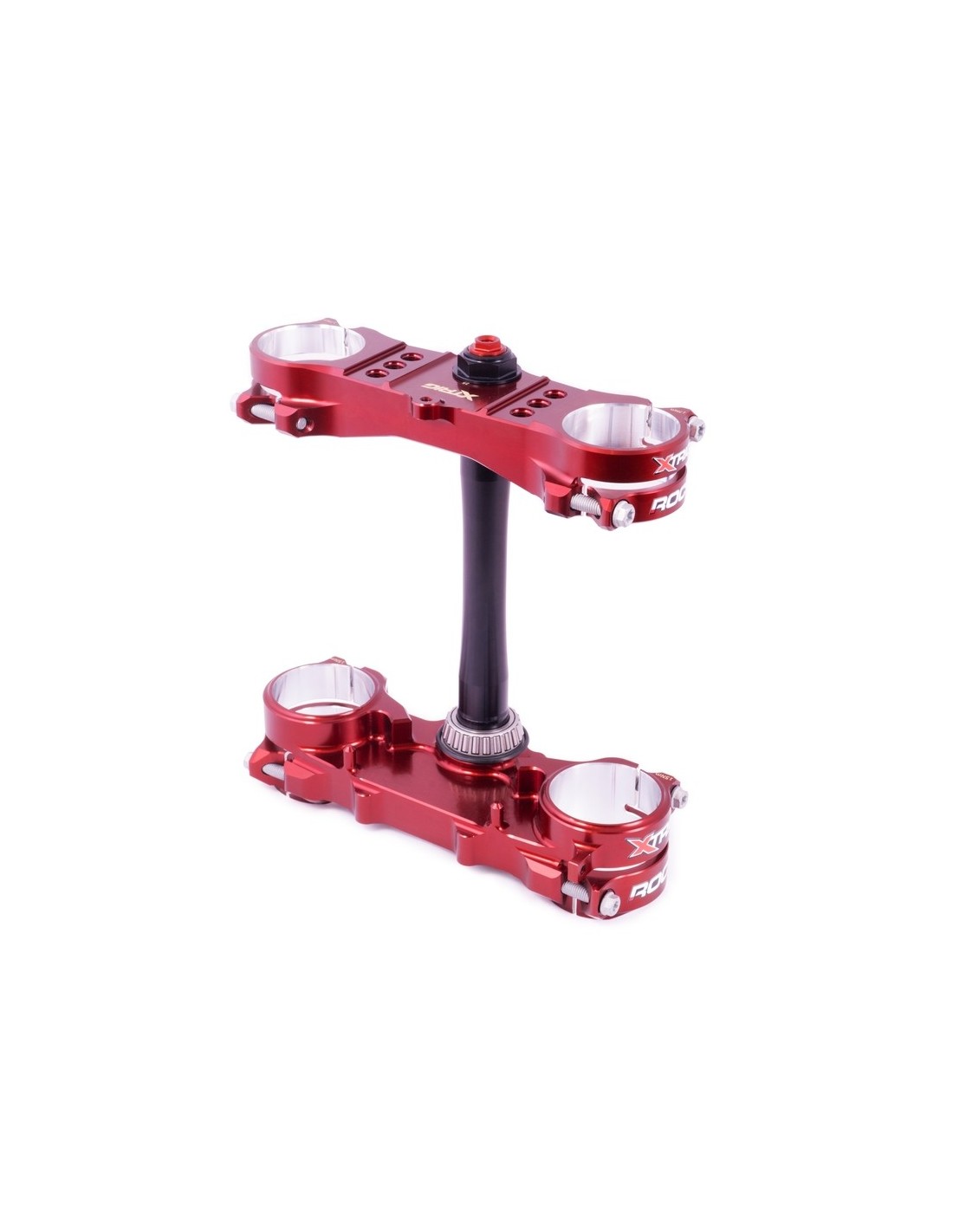 El sistema ROCS (Revolutionary Opposing Clamp System) ha sido uno de los desarrollos más espectaculares y elaborados de XTRIG en los últimos años. Las ventajas de este sistema en comparación con una abrazadera triple convencional son la menor deformación de los montantes de la horquilla en la zona de apriete, que tiene un efecto notable en la respuesta de la horquilla, pero también el diseño con las dos abrazaderas opuestas, que garantizan más seguridad contra la torsión de la horquilla por el efecto de autobloqueo. Otra ventaja es el hecho de que los tornillos de apriete no se influyen entre sí, por lo que se puede conseguir un par de apriete más preciso. Como no hay material entre los tornillos de apriete, las abrazaderas triples ROCS también tienen un peso inferior en comparación.