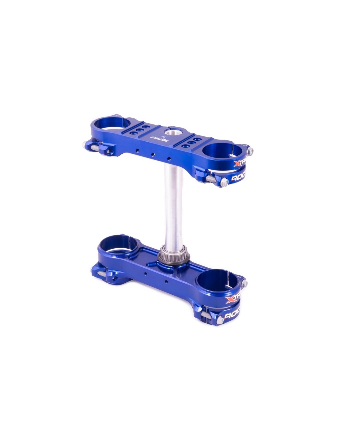 El sistema ROCS (Revolutionary Opposing Clamp System) ha sido uno de los desarrollos más espectaculares y elaborados de XTRIG en los últimos años. Las ventajas de este sistema en comparación con una abrazadera triple convencional son la menor deformación de los montantes de la horquilla en la zona de apriete, que tiene un efecto notable en la respuesta de la horquilla, pero también el diseño con las dos abrazaderas opuestas, que garantizan más seguridad contra la torsión de la horquilla por el efecto de autobloqueo. Otra ventaja es el hecho de que los tornillos de apriete no se influyen entre sí, por lo que se puede conseguir un par de apriete más preciso. Como no hay material entre los tornillos de apriete, las abrazaderas triples ROCS también tienen un peso inferior en comparación.