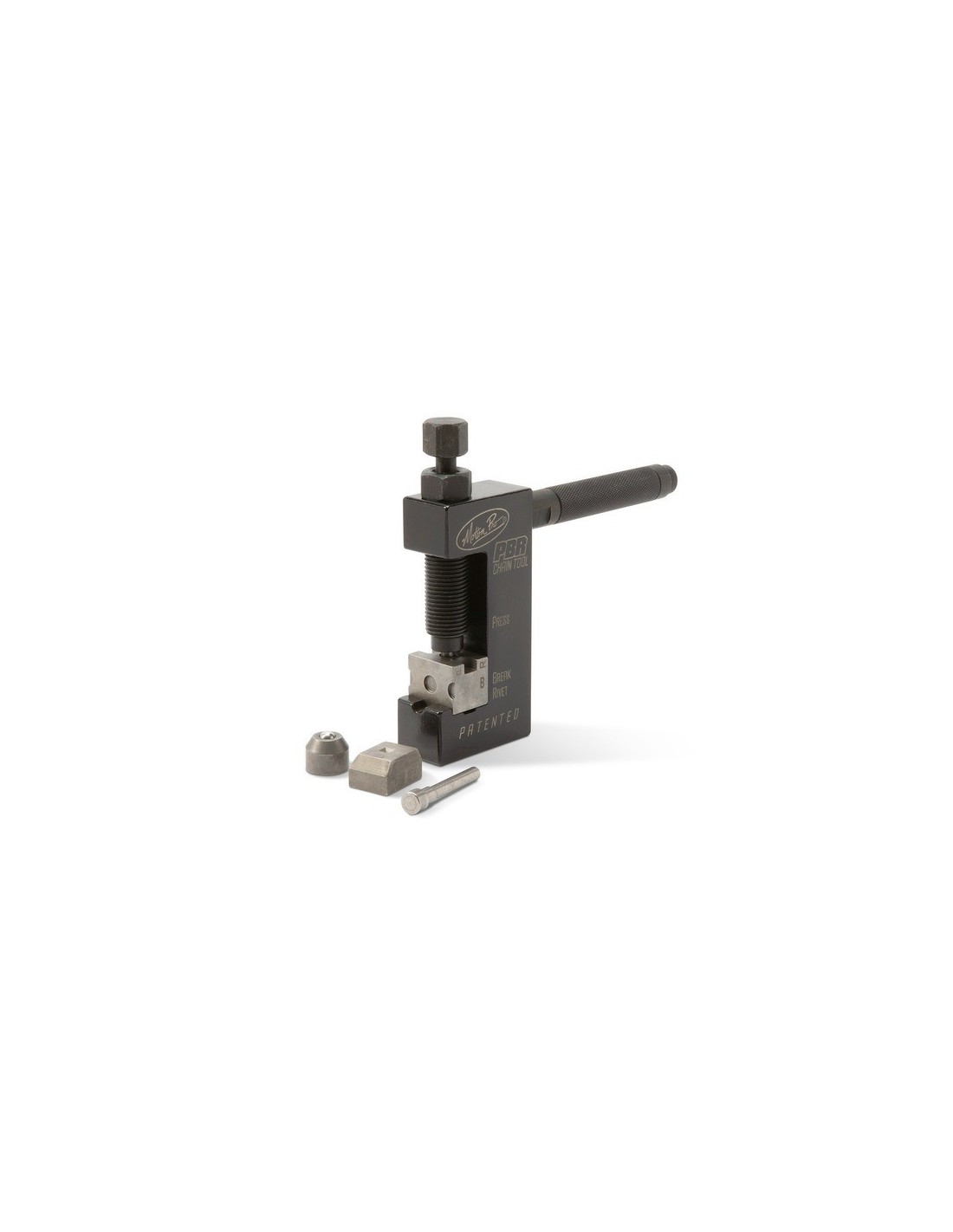 - Su diseño versátil permite quitar los pasadores de la cadena, prensar las placas del eslabón maestro y remachar los pasadores del eslabón maestro de punta hueca y punta blanda (estaca cuádruple) en cadenas con o sin junta tórica