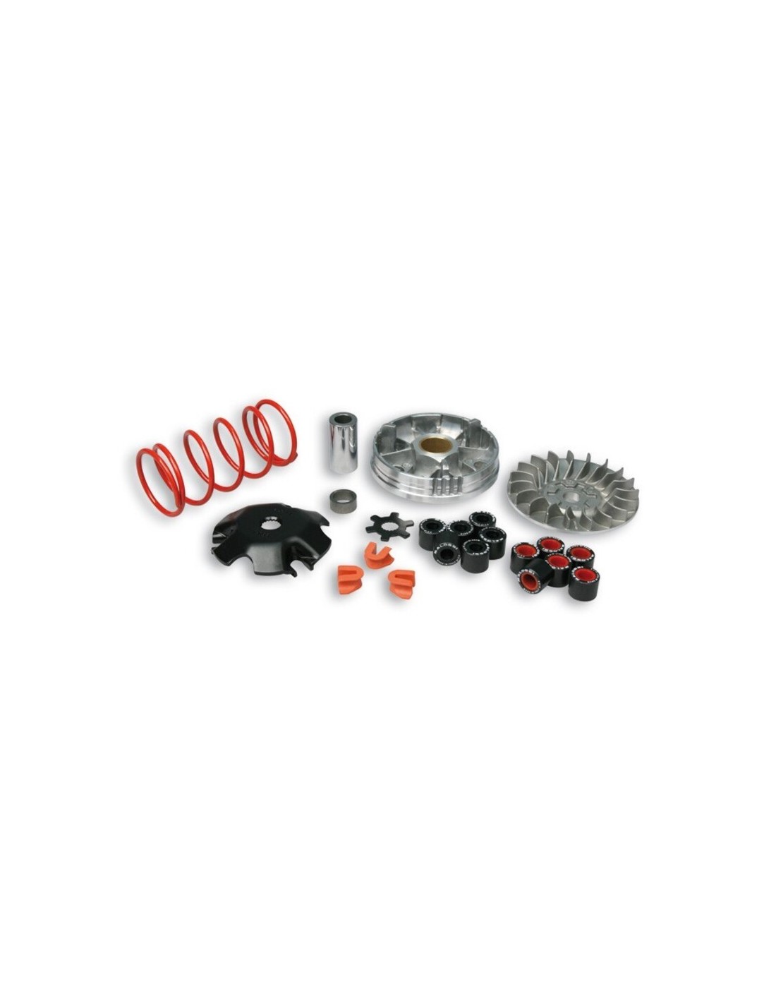 NOTAS TÉCNICAS: el kit contiene una media polea móvil de 99.5 mm de diámetro hecha de una aleación especial de aluminio fundido. La superficie de contacto entre la polea y la correa está superacabada con una herramienta de diamante para garantizar un coeficiente de fricción constante, calculado para evitar tanto el deslizamiento de la correa como el desgaste prematuro. Para satisfacer las innumerables calibraciones requeridas por los scooters de competición, dependiendo del tipo de pista y la afinación del motor, el kit contiene 2 series de 6 rodillos y un contraresorte de aleación de acero con cromo-silicio preendurecido y bobinado en contra del sentido de las agujas del reloj (competición). Además, están disponibles como opciones otros resortes de la misma clase con diferentes cargas.